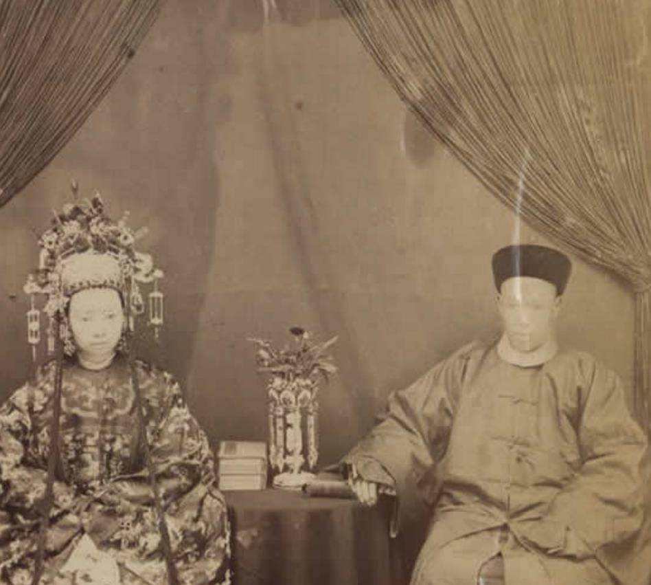 图中的新郎新娘是晚清时期福建一带的婚礼留影。新娘头戴传统凤冠霞帔,身穿精致的红色补服和马面裙,整个人看起来美丽而典雅。新郎则穿着较为朴素,给人一种平实温和的感觉。那种古老的婚礼仪式与服饰,仿佛带我们走进了那个时代的幸福时光。照片中的每一细节都让人感受到一份历史的厚重与美好。