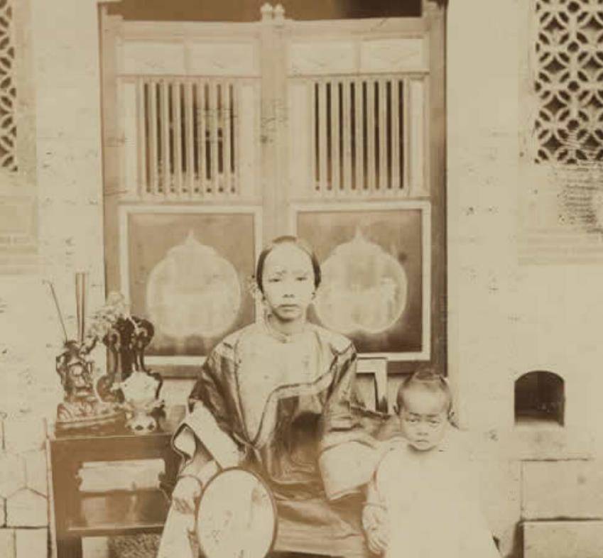 这是晚清时期福建永春一户富贵人家的原配夫人和孩子的合影。夫人穿着华贵精美的服饰,清秀的面容和优雅的气质显得尤为引人注目。她的穿着和姿态,映衬着背后那座宽阔的宅邸,隐约流露出家境的富贵与尊荣。那份从容和端庄,仿佛把那个时代的贵族气息展现得淋漓尽致。通过这张照片,我们仿佛看到了那个时代女性的优雅与风采,也看到了历史上那些不为人知的家族故事。