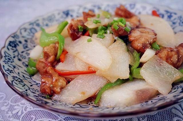 渐变色法则:双笋炖鸭肉(莴笋的浅绿+冬笋的米白)