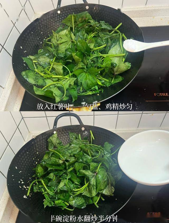 红薯叶焯水时加几滴柠檬汁(保持翠绿)