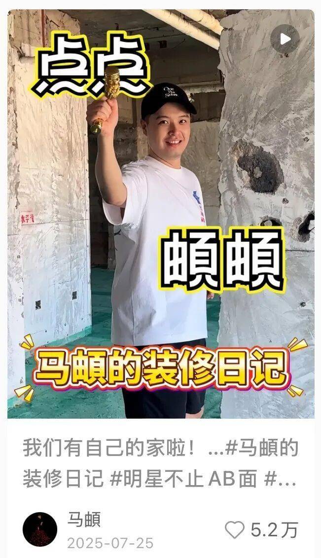 马頔在买房装修这件事上确实付出了很多努力。他上《五哈》称是为了买房,在综艺里多次 cue 装修梗,还发过装修的 vlog,在社交软件上也频繁输出自己在房子上的付出,强调自己很拼很累。他所购买的房子是北京 300 平的大平层,由两个房子打通,一个灯具预算就在 5000,这对于普通工薪家庭出身的他来说,压力巨大。毕竟他父亲开出租车,原生家庭给予的托举有限,以前谈恋爱时还穷到抱着女友在大街上哭。