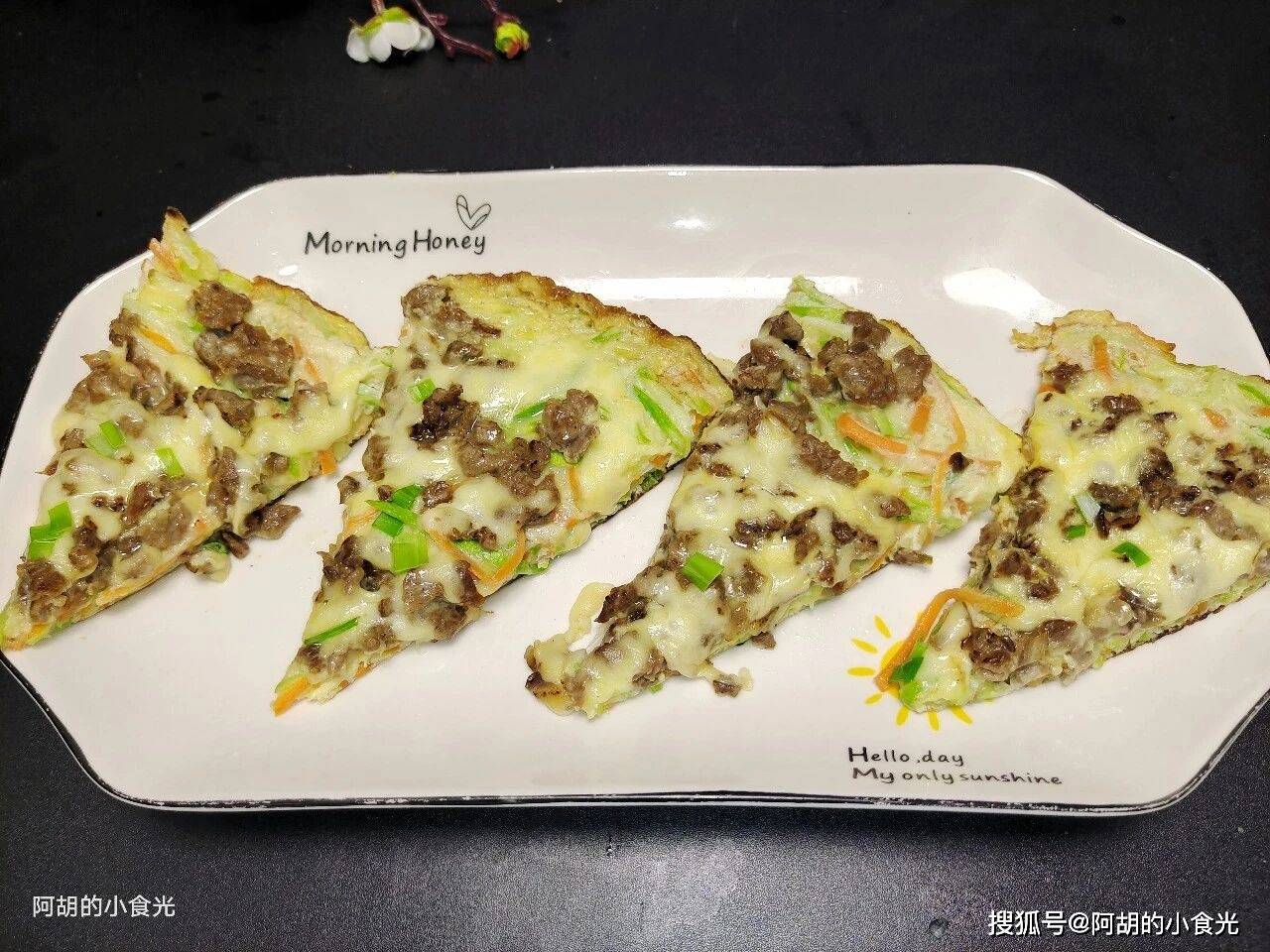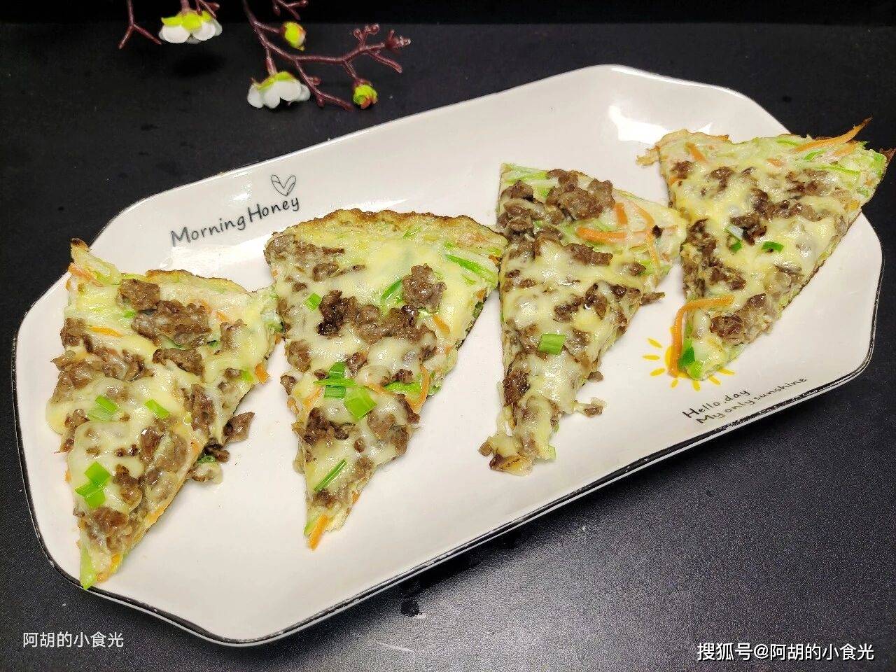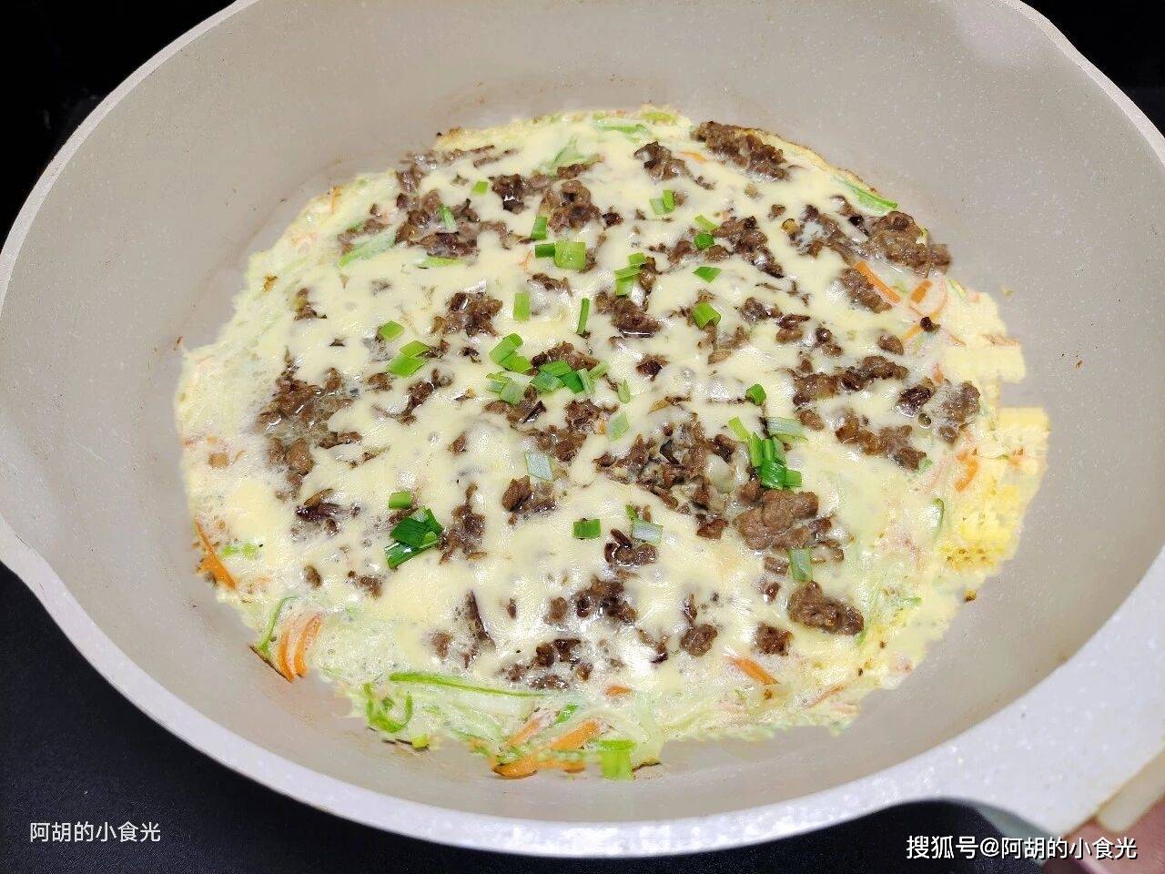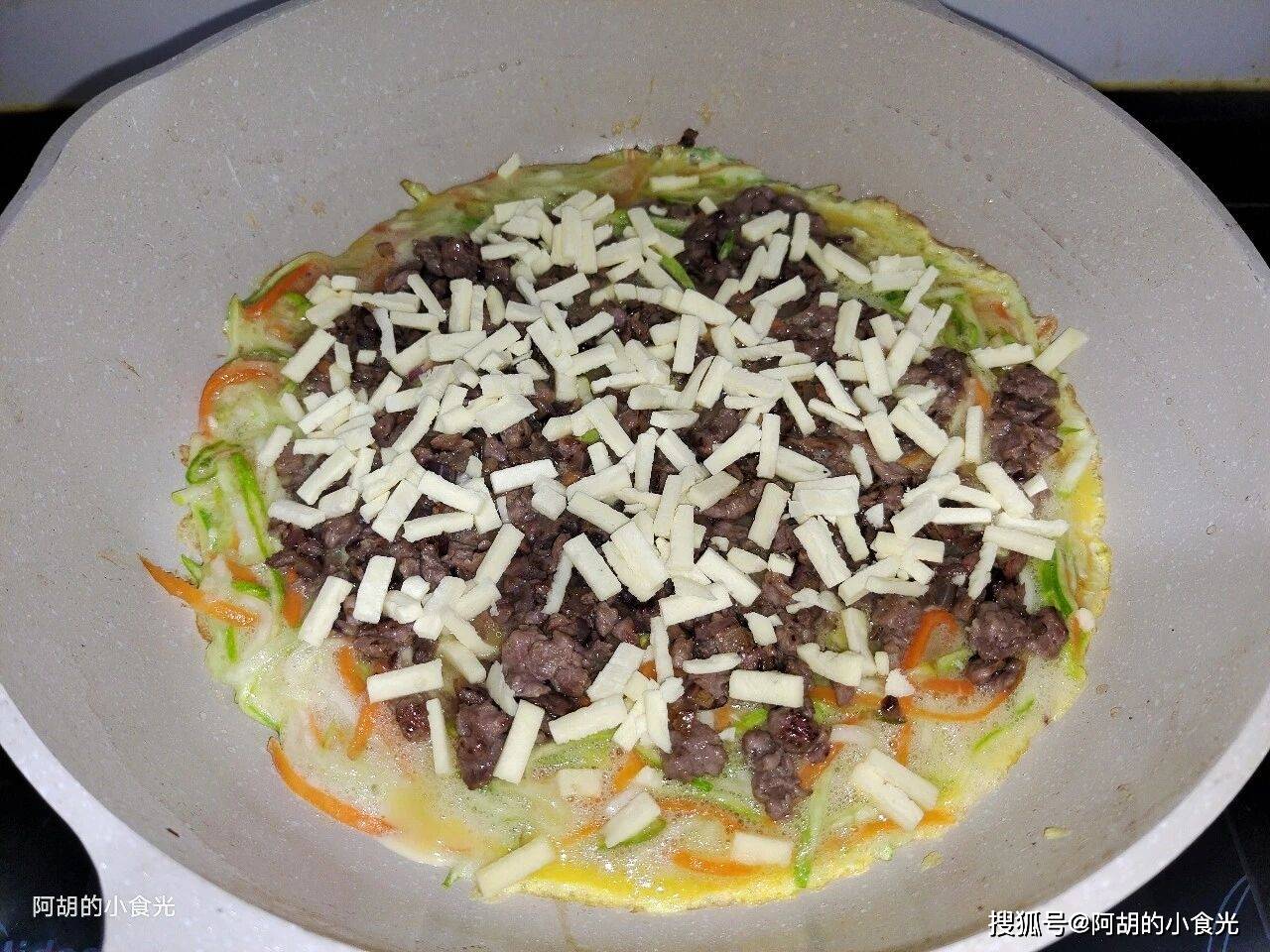 第五步:取出炒熟的牛肉碎铺在上面,再把芝士碎也洒在最上面,而后加盖就这样保持小火慢慢地焖一焖,差不多三四分钟左右就可以关火了,如果你的蛋液和蔬菜比较厚,怕三分钟无法熟透,这里建议可以往锅边淋入一些开水,加盖焖至水分烧干就可以了,此时最上面的奶酪碎已经全部融化,切开后还能拉丝,底部蔬菜和鸡蛋也是特别的鲜嫩,上面则有淡淡的奶香,特别的开胃,作为早餐吃更健康营养,值得试一试。