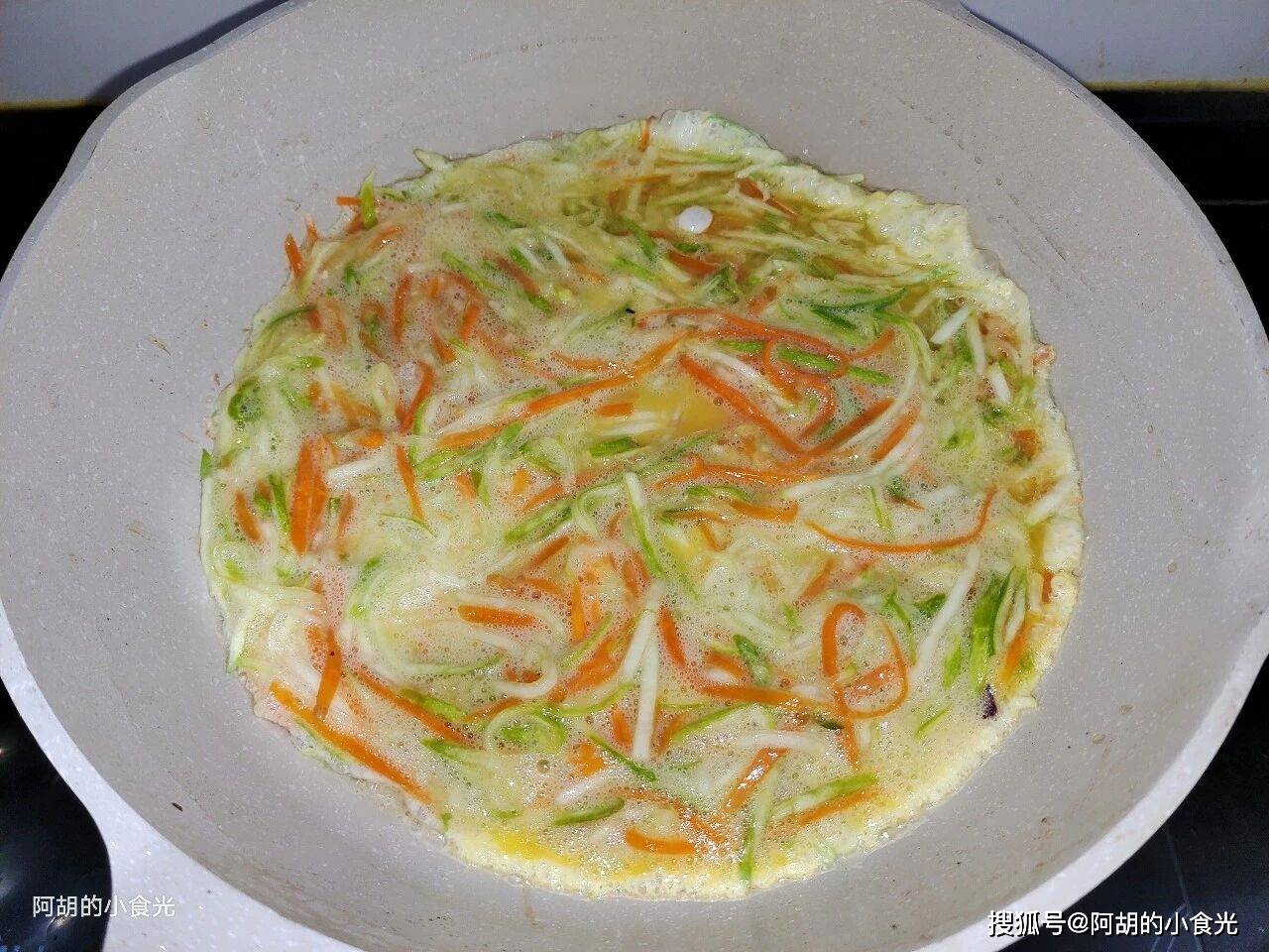 第四步:取出西葫芦和胡萝卜丝,往其中打入四个鸡蛋,撒入一些食盐充分地搅拌均匀。起锅淋入少许食用油小火烧热,将蛋液和蔬菜一块倒入锅中,将其整理平整。