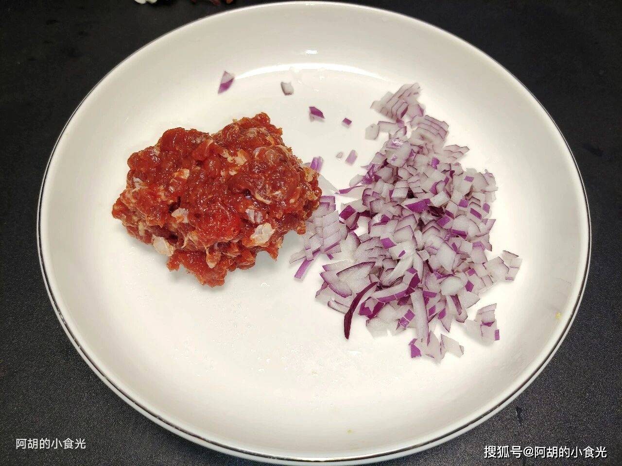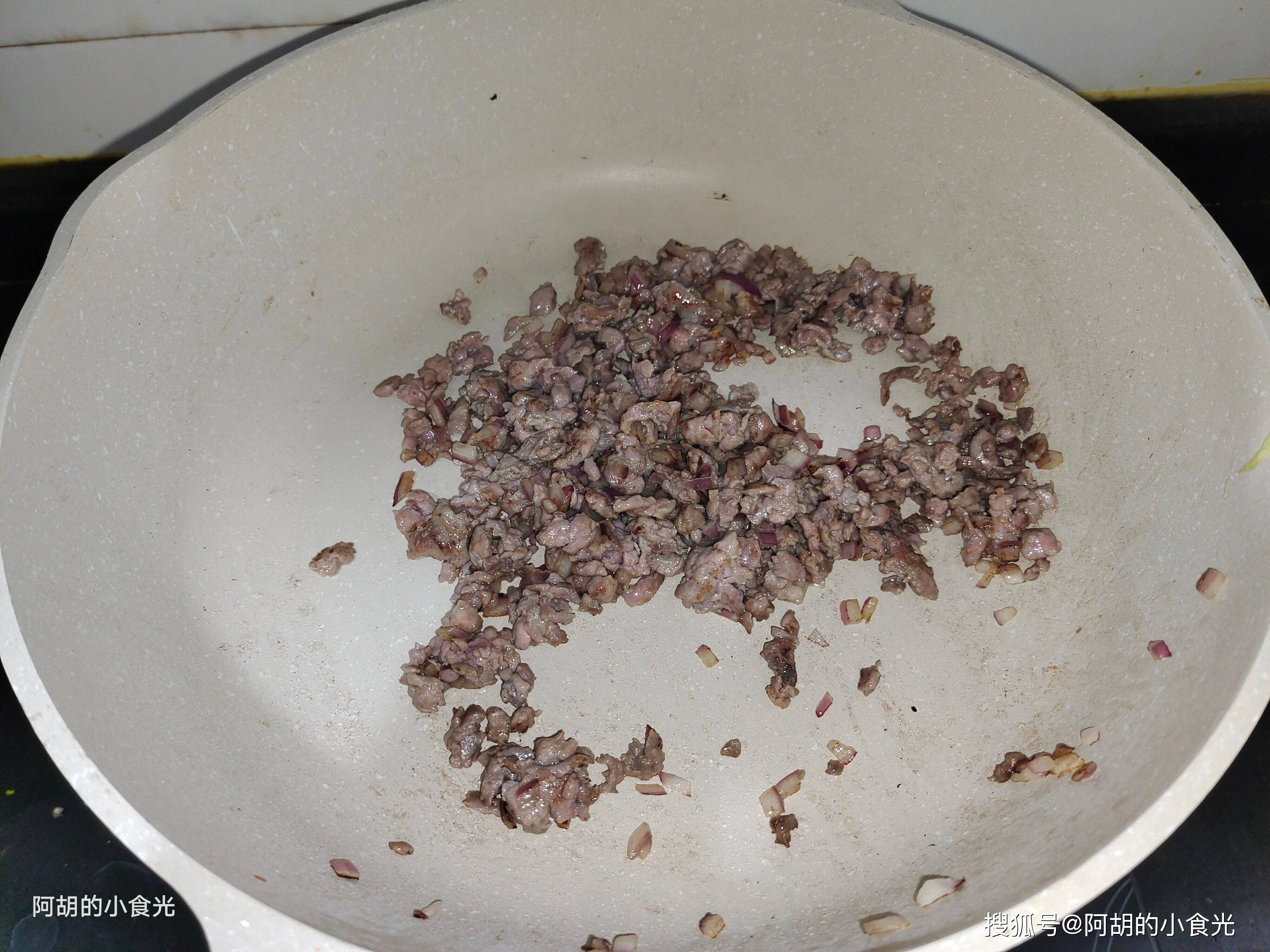 第三步:锅里烧少许的食用油,油热后把洋葱碎倒入锅中炒出香味,接着把腌制好的牛肉碎也倒入锅中炒熟炒出香味,盛出后备用。
