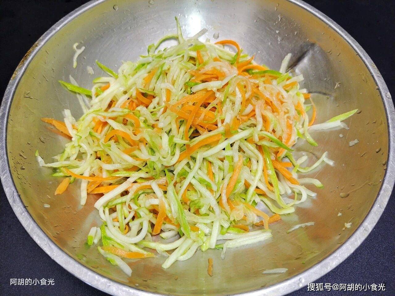 2. 挤去多余水分后,将蔬菜丝放入盆中备用。