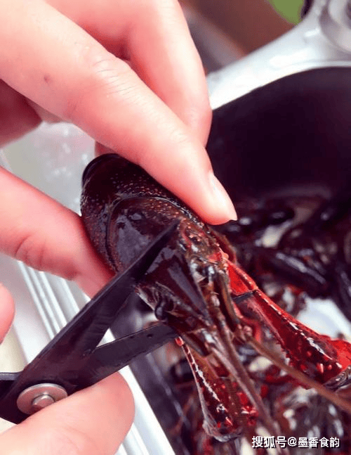 3. 剪头去胃囊:用剪刀从小龙虾头部前端斜着剪一刀,挑出黑色的胃囊。