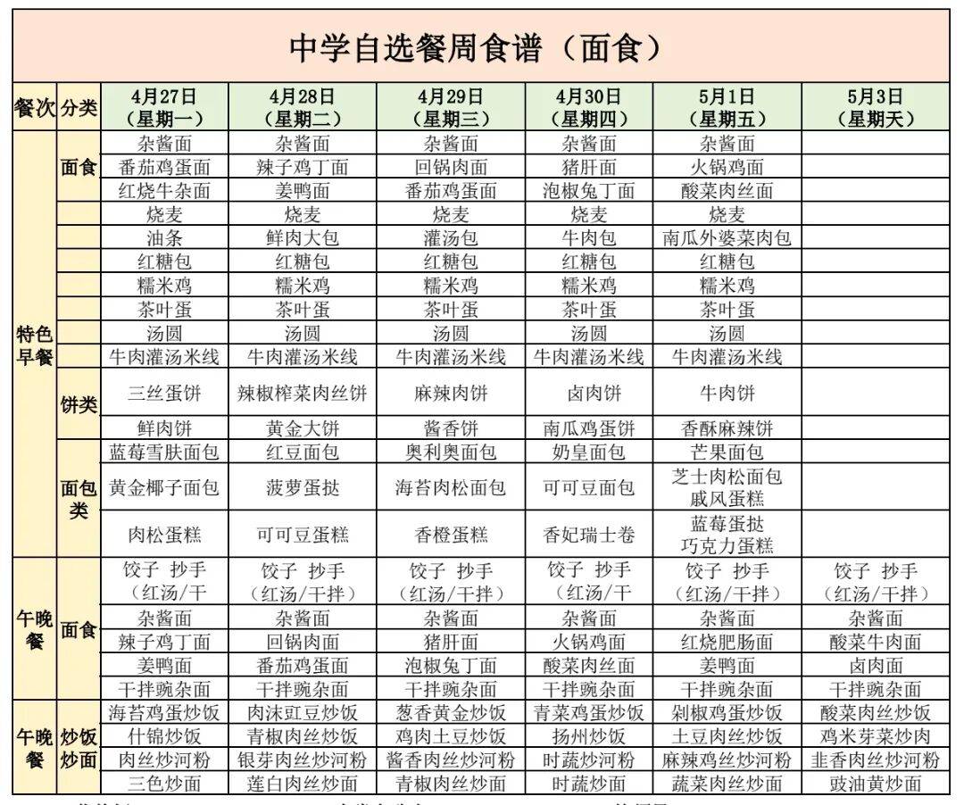早餐:白水鸡蛋、绿豆粥、酱肉包、芝麻花卷、桂花发糕、菠萝面包、炒榨菜丝、炝炒包菜、新希望牛奶
