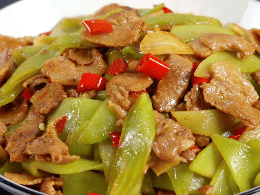 晚餐:米饭、铁锅炖大鹅、土耳瓜炒肉、青椒肉丝、炝炒莴笋尖、萝卜汤