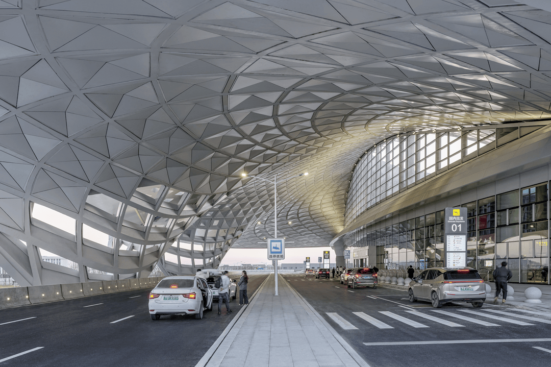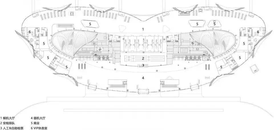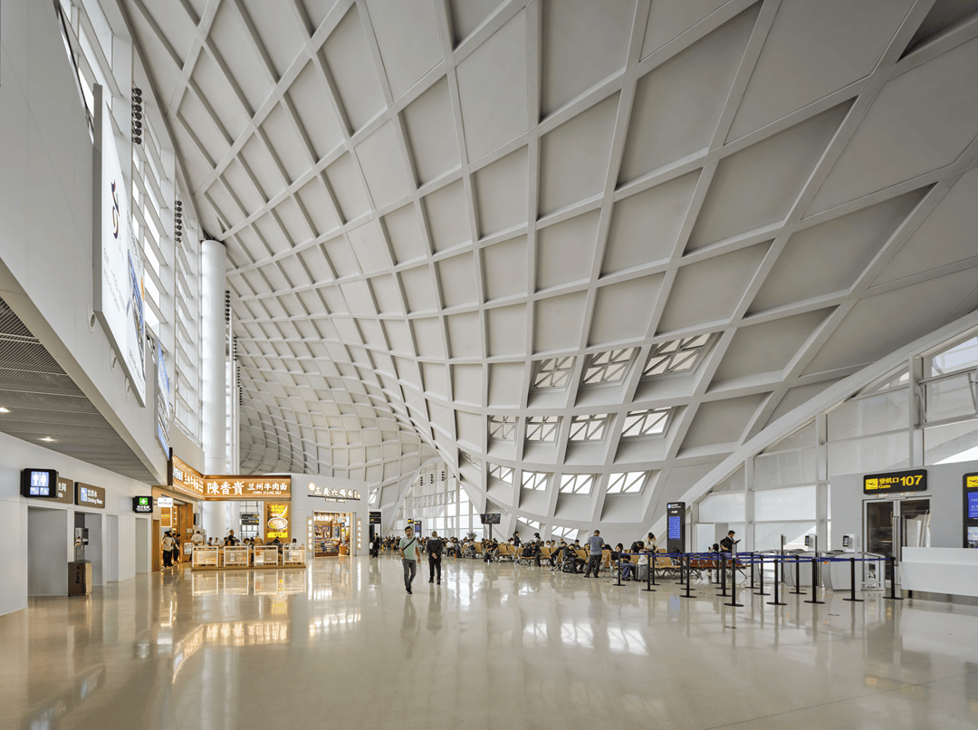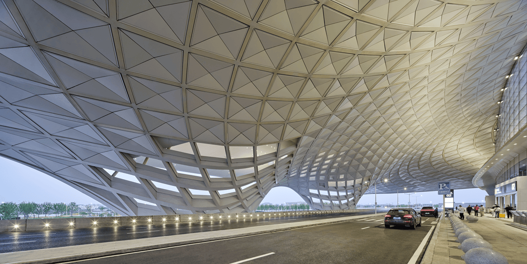 2. 空间魅力:结构成为空间主角,结构构件同时作为装饰构件充分外露,展示流动感的结构逻辑。办票厅内曲面自然交叠增加空间层次;候机厅中拱状玻璃形成独特景观视角;建筑空侧因结构拱脚呈现韵律丰富的形象。
