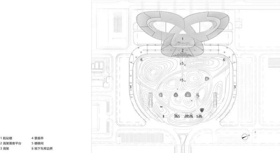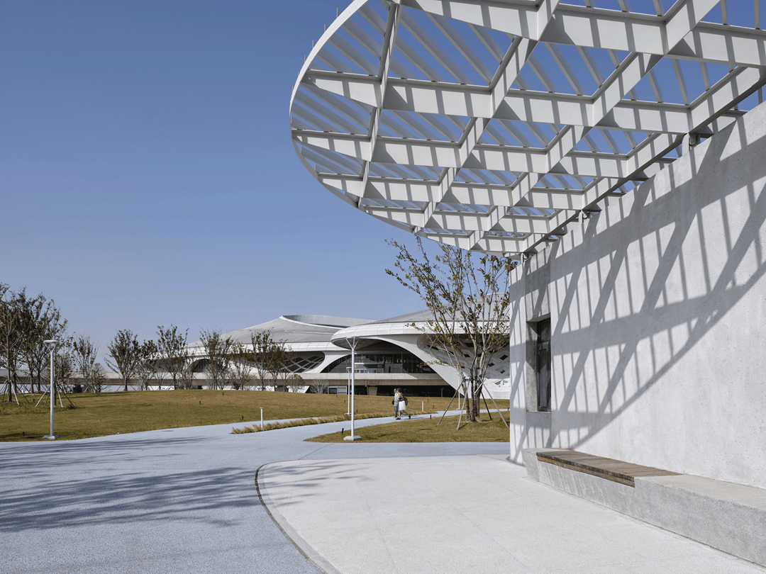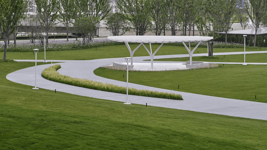 航站楼前主景观区域下有地下车库,风井和楼梯间等凸出地面的“小盒子”给景观设计带来挑战。设计提出与航站楼设计一脉相承的“无限环”设计语言,串联楼梯间出入口,将场地划分为完整斑块并塑造为连绵起伏的草坡,削减“小盒子”体量感。“小盒子”外部采用镜面不锈钢包覆并种植小乔木,使其融合到周边景观中。在场地中部无法消隐的小盒子上设置圆弧三角形构架顶棚和遮阳休憩亭,让景观更具公共性、人性化和体验感。