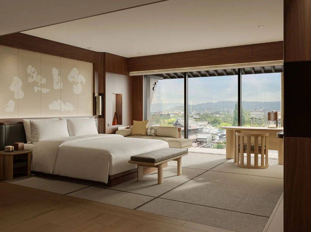 2. 客房设置:89间客房围绕庭院展开,基础客房面积50平方米起,29间套房中有6间配备私汤,顶层Capella Suite面积达206平方米,可眺望东山天际线、八坂塔与宫川町屋顶景观。