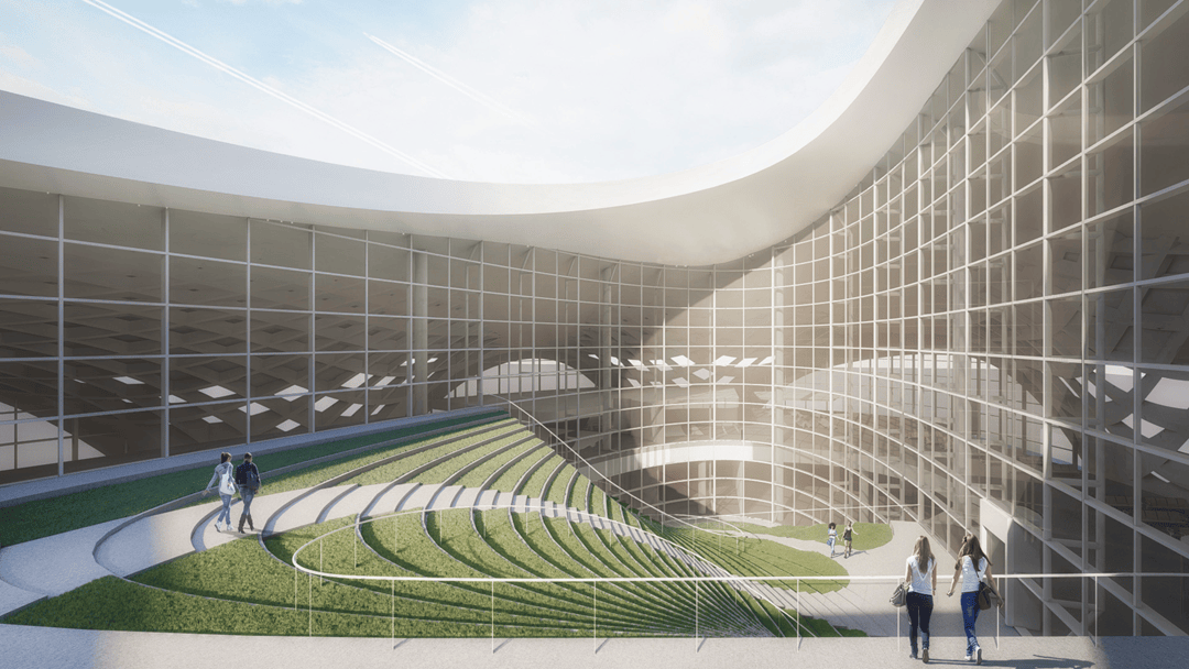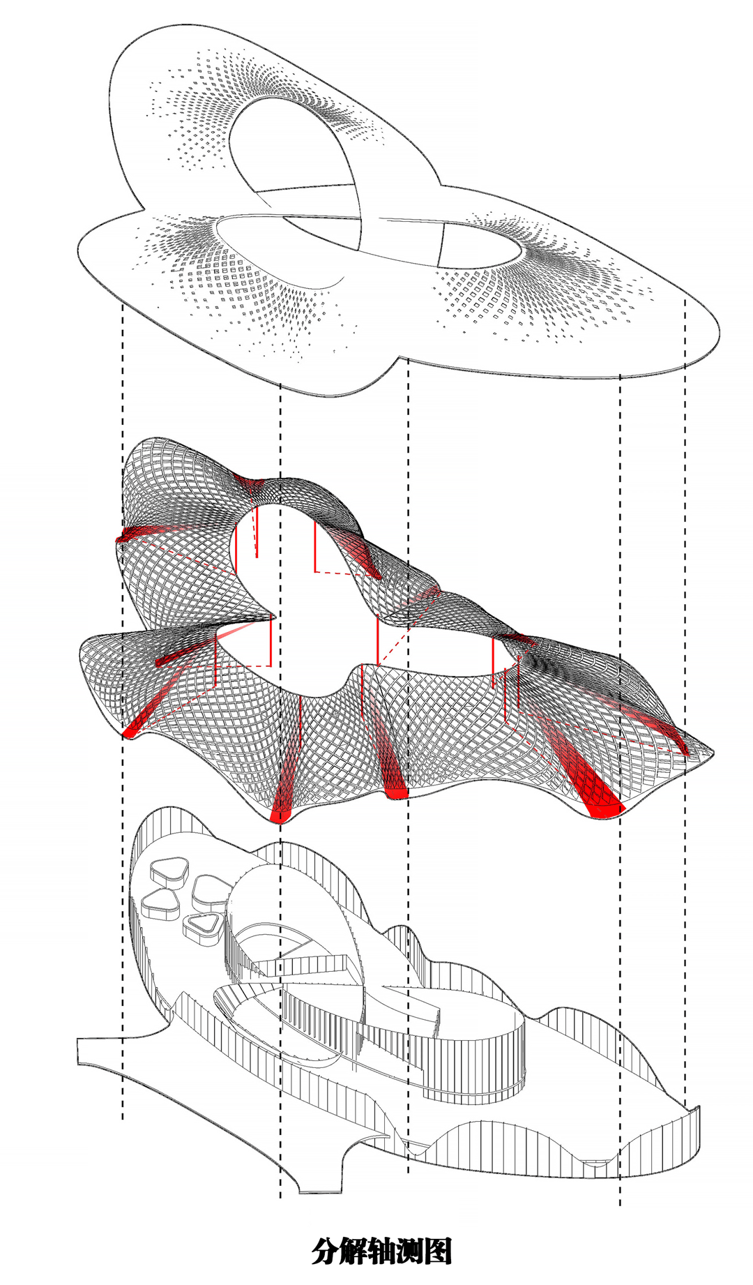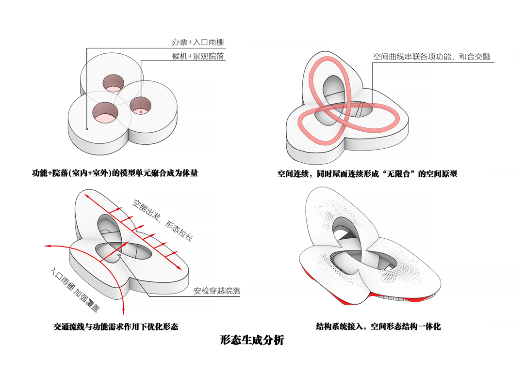 2. 形态生成:机场办票区和候机区支撑了三个环构成的空间形态。前部环容纳办票功能,后部两个并列延伸的环容纳候机功能并衔接登机廊桥。三个环融合交织,形成三向扭曲循环相交的曲面,类似“三向莫比乌斯环”。每个曲面环高低交错,远观屋顶形态与远山对话。曲面的屋顶由下部另一个起伏曲面支撑,边缘形成“裙边”起伏拱,内部融合在屋面曲面中,呈现“山形海势,和合圆融”的效果。因形态演化出的前部环形曲面还包含落客区雨篷功能,包裹高架桥落地部分,保证航站楼形态完整。