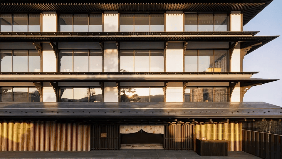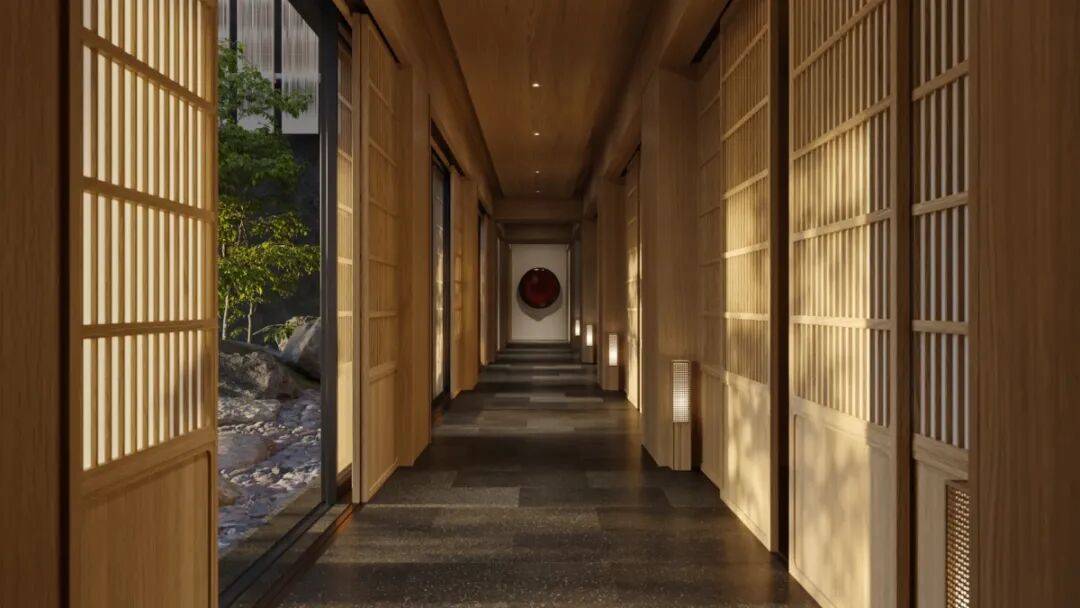 1. 空间转化:建筑从京都传统町家出发,将狭长进深、层层递进的空间秩序转化为当代酒店体验。强调“由外入内”的渐进感,从带有祇园巷道气质的入口开始,经过障子、壁龛、水声与明暗变化逐步进入核心空间,让人在移动中感知京都特有的节奏。
