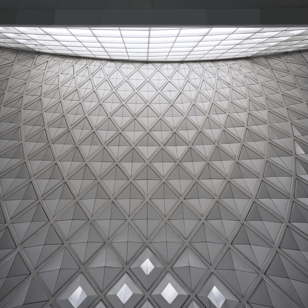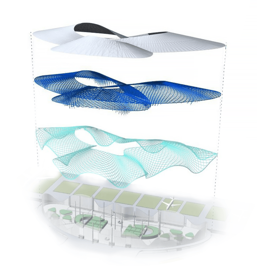 1. 结构体系:不规则连续扭曲的屋面带来巨大结构挑战,最终形成三片不规则屋面、形似连续劈椎拱以及连接二者的金属撑杆构成的结构体系。复杂曲面以菱形为结构几何单元进行有理化,在机场内部二层形成无柱空间效果。