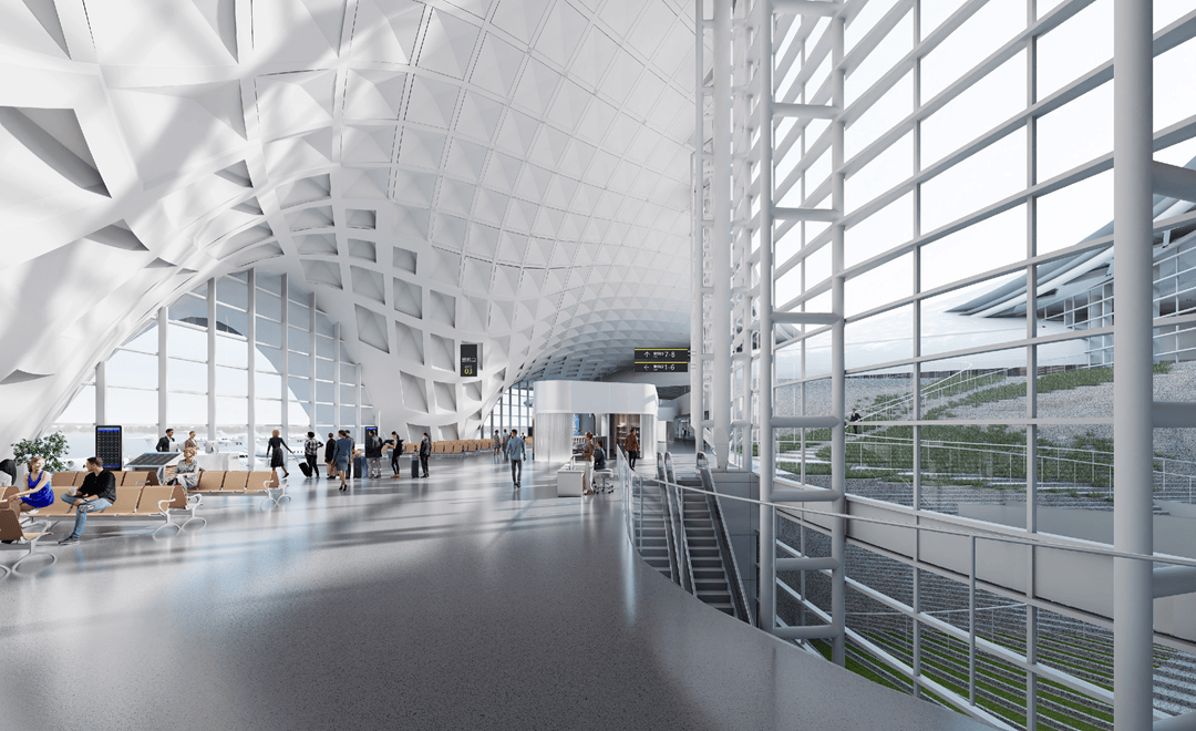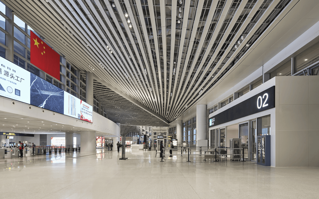 建筑室内设计采用简洁和本体化策略,突出建筑空间完整逻辑与结构构件韵律。“无限”环绕空间形成两个直通出发层的大型完整院落,面积达1000余平方米,保留空侧乘客进入可能性,为乘客提供完整生态景观体验。