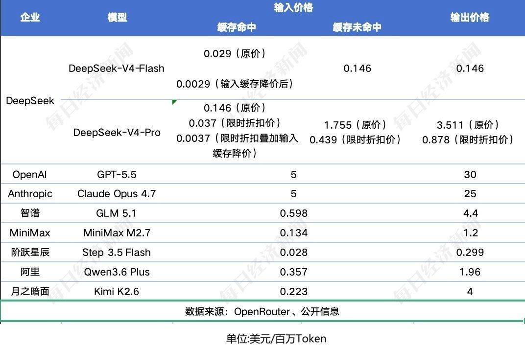4月25日晚,DeepSeek宣布对V4-Pro模型API开启限时2.5折价格优惠。26日晚,DeepSeek又宣布DeepSeek全系列API服务,输入缓存命中的价格降至原有价格的1/10。其中,Pro模型在2026年5月5日前叠加2.5折限时优惠。最新调价后,DeepSeek-V4-Flash每百万tokens输入缓存命中价格为0.02元,DeepSeek-V4-Pro为0.025元。