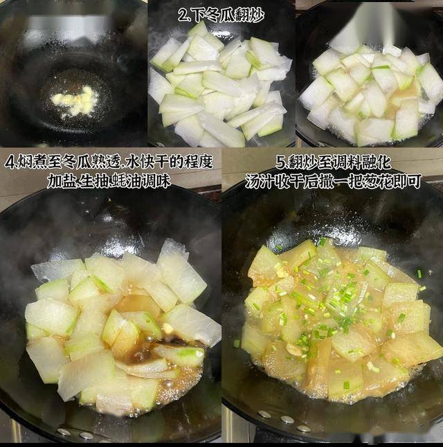 1. 冬瓜去皮,去瓤,洗净后切成小块。生姜切成丝,小葱切成葱花备用。