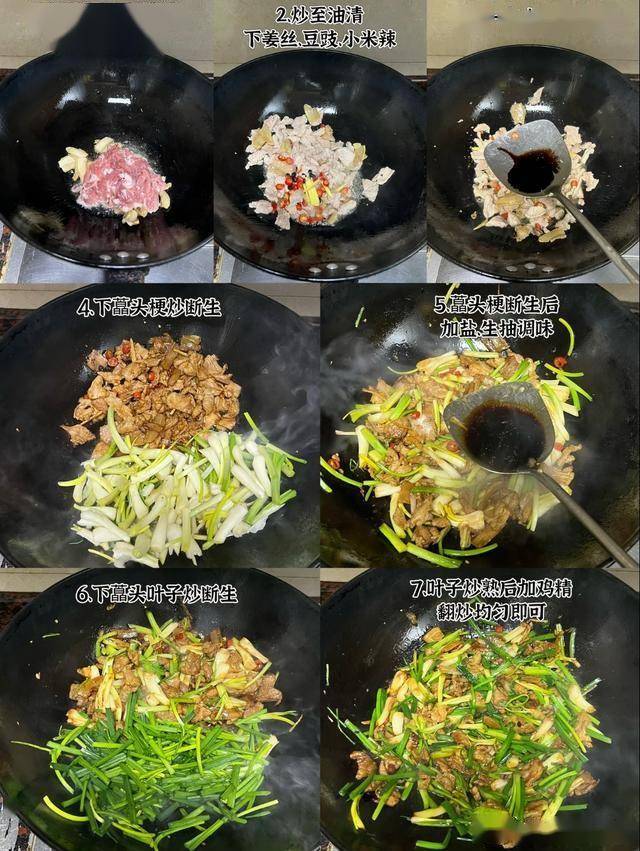 5. 放入切好的藠头段,大火快速翻炒,使藠头与五花肉充分混合。炒至藠头断生,加入适量盐调味,继续翻炒均匀,即可出锅装盘。