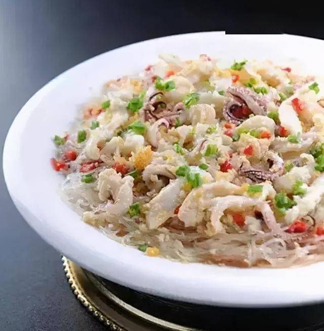 2、净锅里放油,先下蒜米20克炒香,再把水发粉丝下锅并加盐炒几下,起锅盛盘中垫底。另把剩余的蒜米在锅里用色拉油炒香,盛盆里并调入蚝油、盐、鸡精和味精,然后倒入鲜鱿鱼拌匀,摆在盘中粉丝上边,入笼大火蒸4分钟,取出淋蒸鱼豉油并撒上葱末、红椒粒,最后浇热油激香即成。