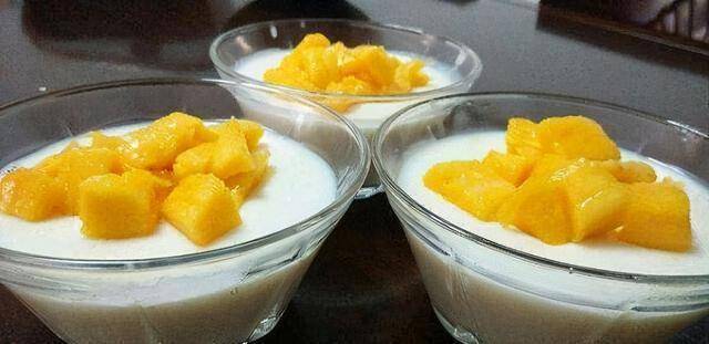 2、芒果切成小丁,把刚煮好的椰浆层倒入盘中,再把芒果放出来