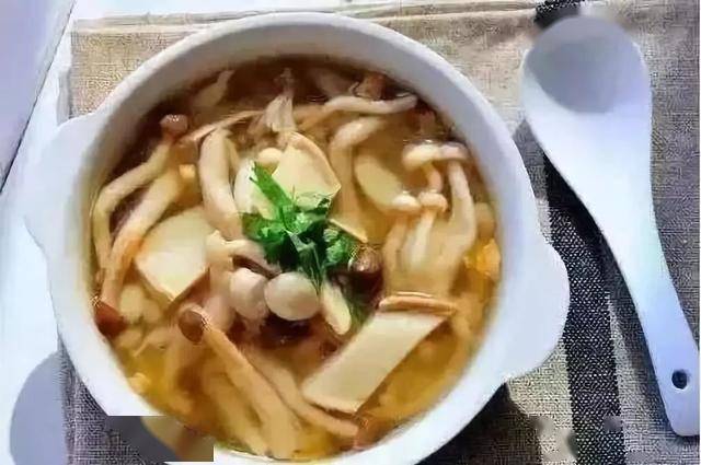 用料:白蟹味菇70克、灰蟹味菇70克、干杏孢菇10克、姜3克、香菜少许、盐适量、白胡椒少许