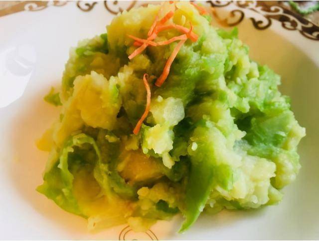 6、加苦瓜和土豆泥,翻炒,加盐和鸡粉,炒匀