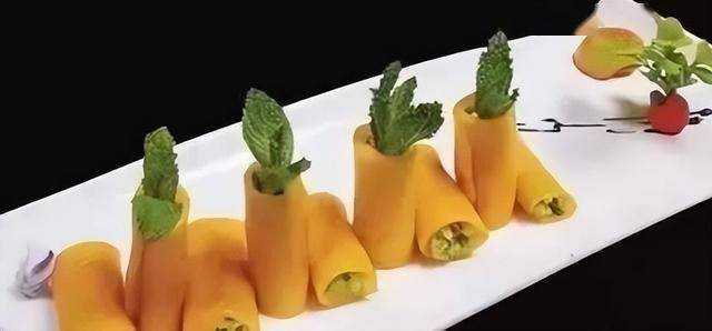 2、卷起来用刀修整齐后插入薄荷叶摆盘即可。