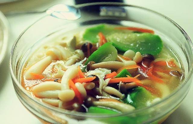 4.加入胡萝卜丝烧一会儿,撒盐调味,再加入金针菇煮开;放入炒好的鸡蛋白,淋麻油关火;把煮好的汤浇在煮过的丝瓜上;拌一下即可;