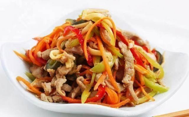 食材:羊肉200g、青椒1个、红椒1个、紫椒1个、胡萝卜1根、油适量、杏鲍菇、盐、生抽20g、淀粉5g、料酒