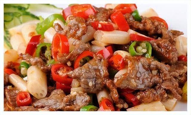 食材:里脊牛肉、小藕、红椒、青椒、泡椒、淀粉、盐、香油、酱油、油、大蒜、生抽、蚝油