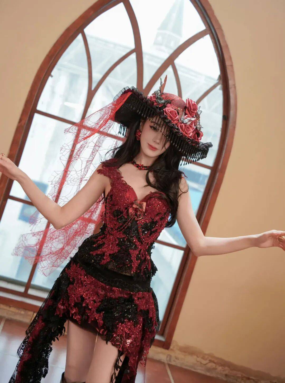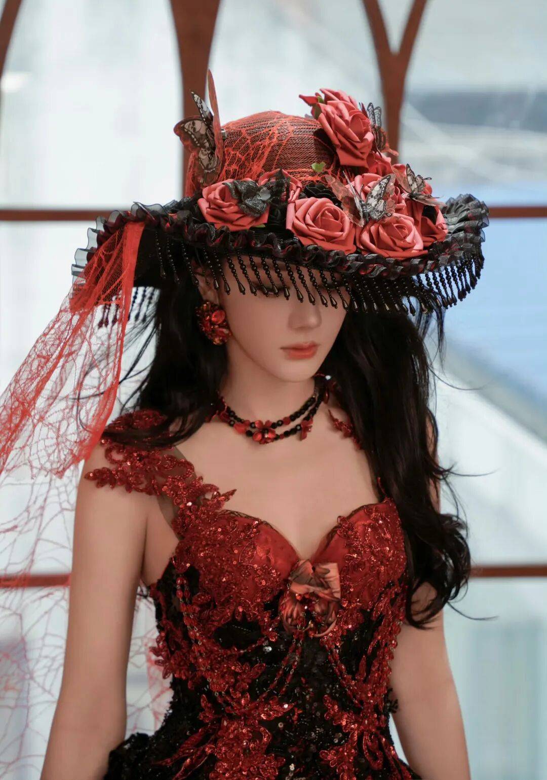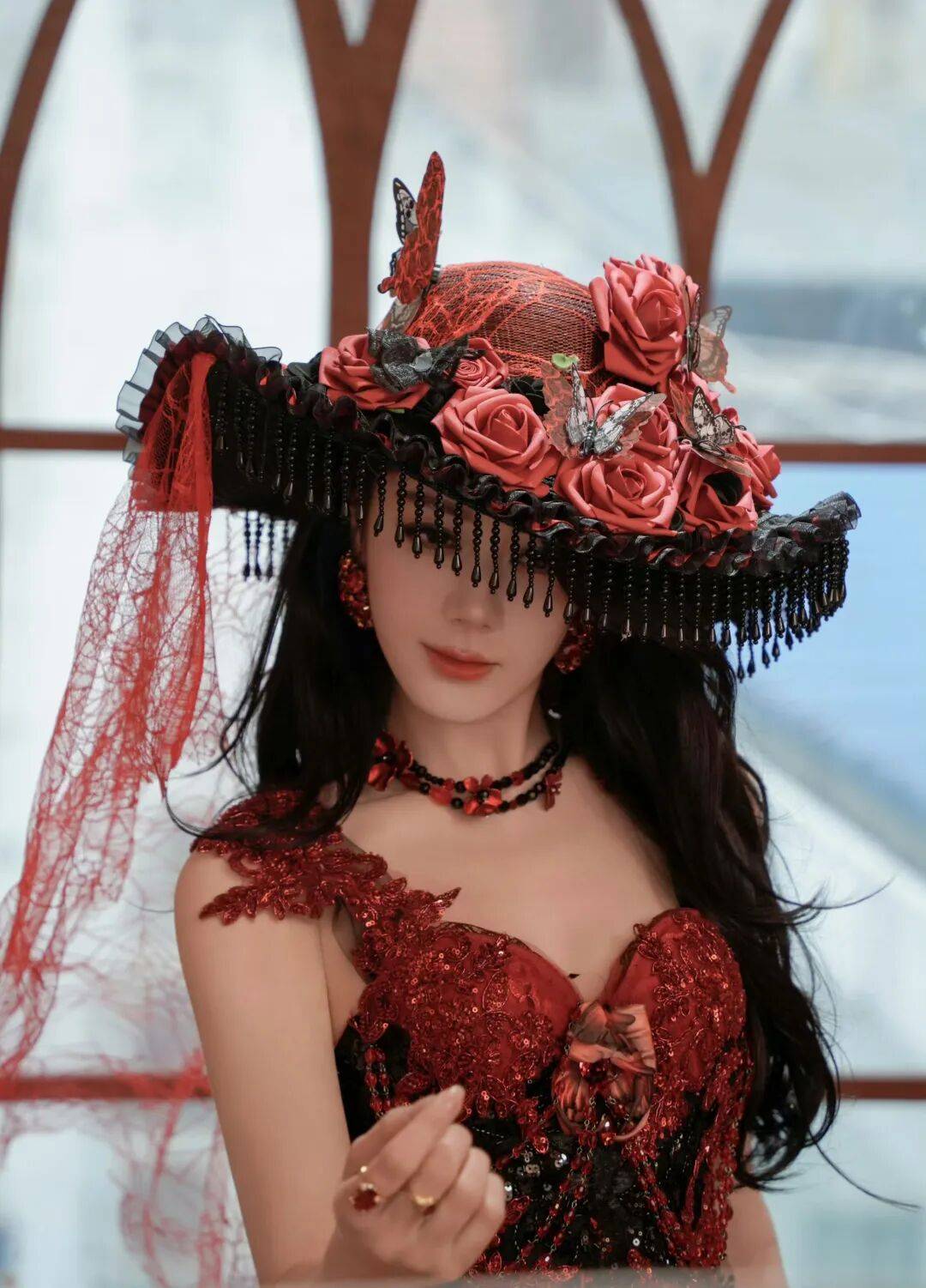 鱼骨腰封勾勒出完美腰臀比,不规则裙摆灵动又性感,大长腿优势尽显。最绝的是那顶缀满红玫瑰与黑色流苏的宽檐礼帽,搭配飘逸的蛛网状红纱,神秘魅惑感直接拉满。