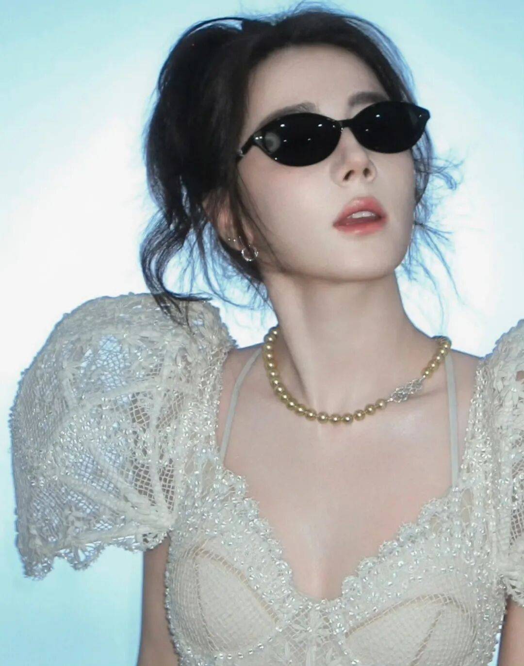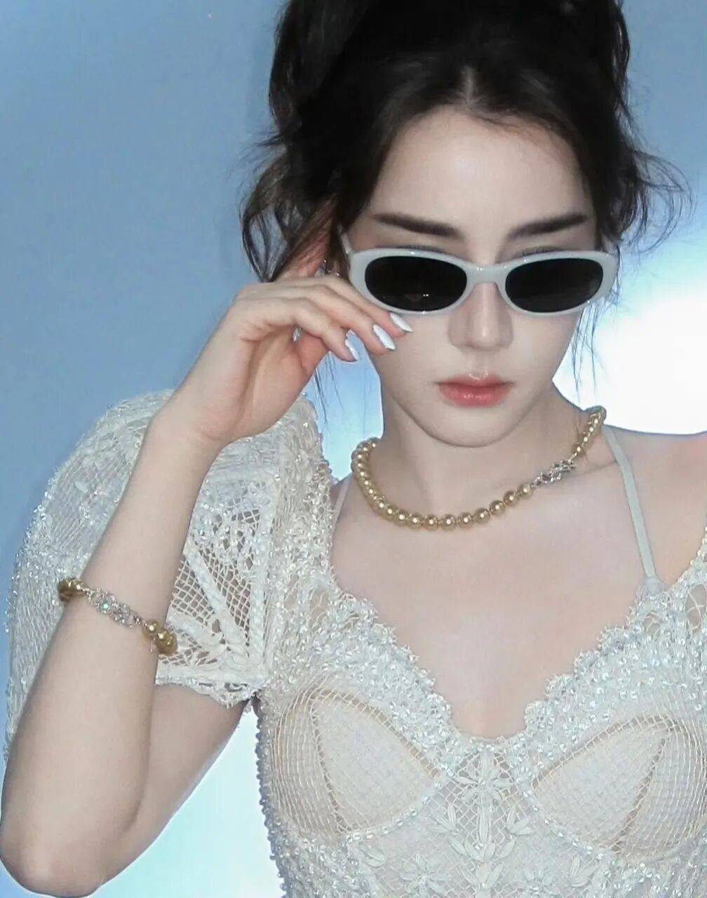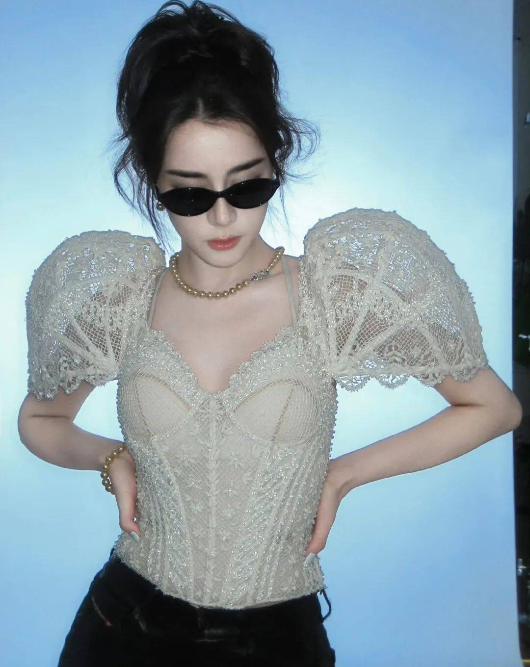 迪丽热巴身穿白色高肩的透视上衣,她头戴黑色墨镜,脖子上是黄色珠宝首饰,长发盘起,她吐出舌头的样子很俏皮,美得让人窒息!