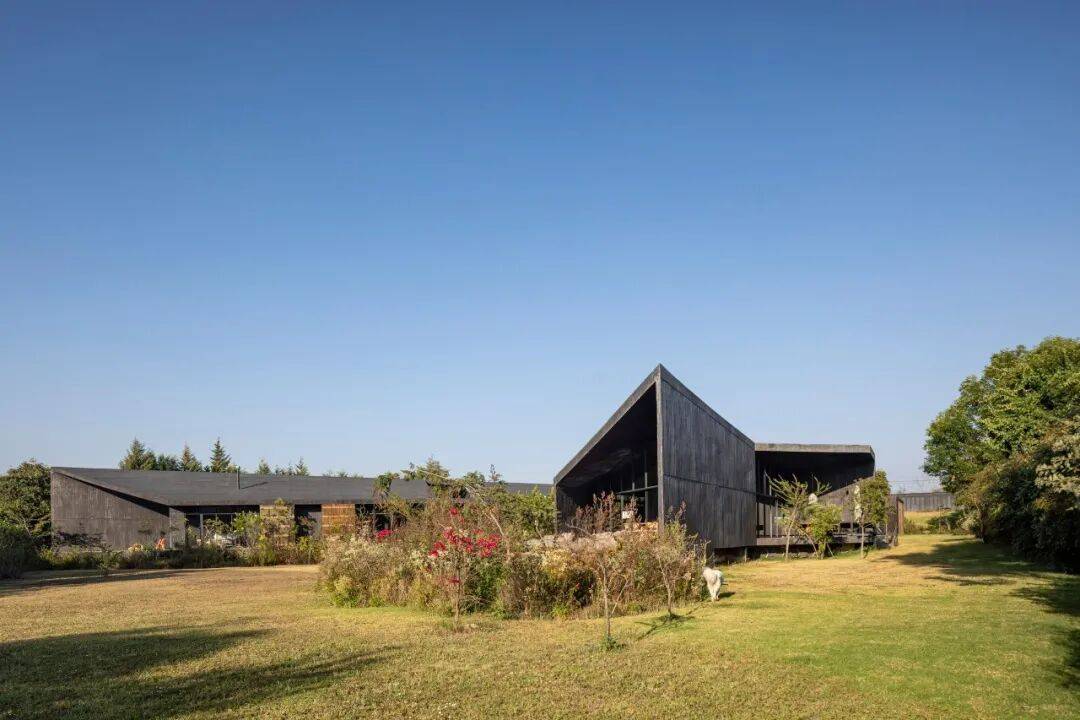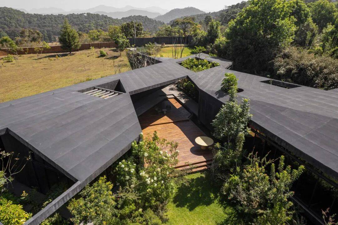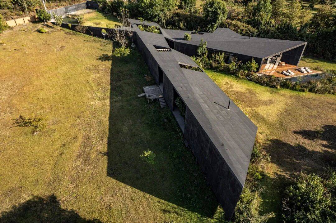 黑色混凝土体量如“伏地的岩石”,与山地景观形成地质层般的对话。