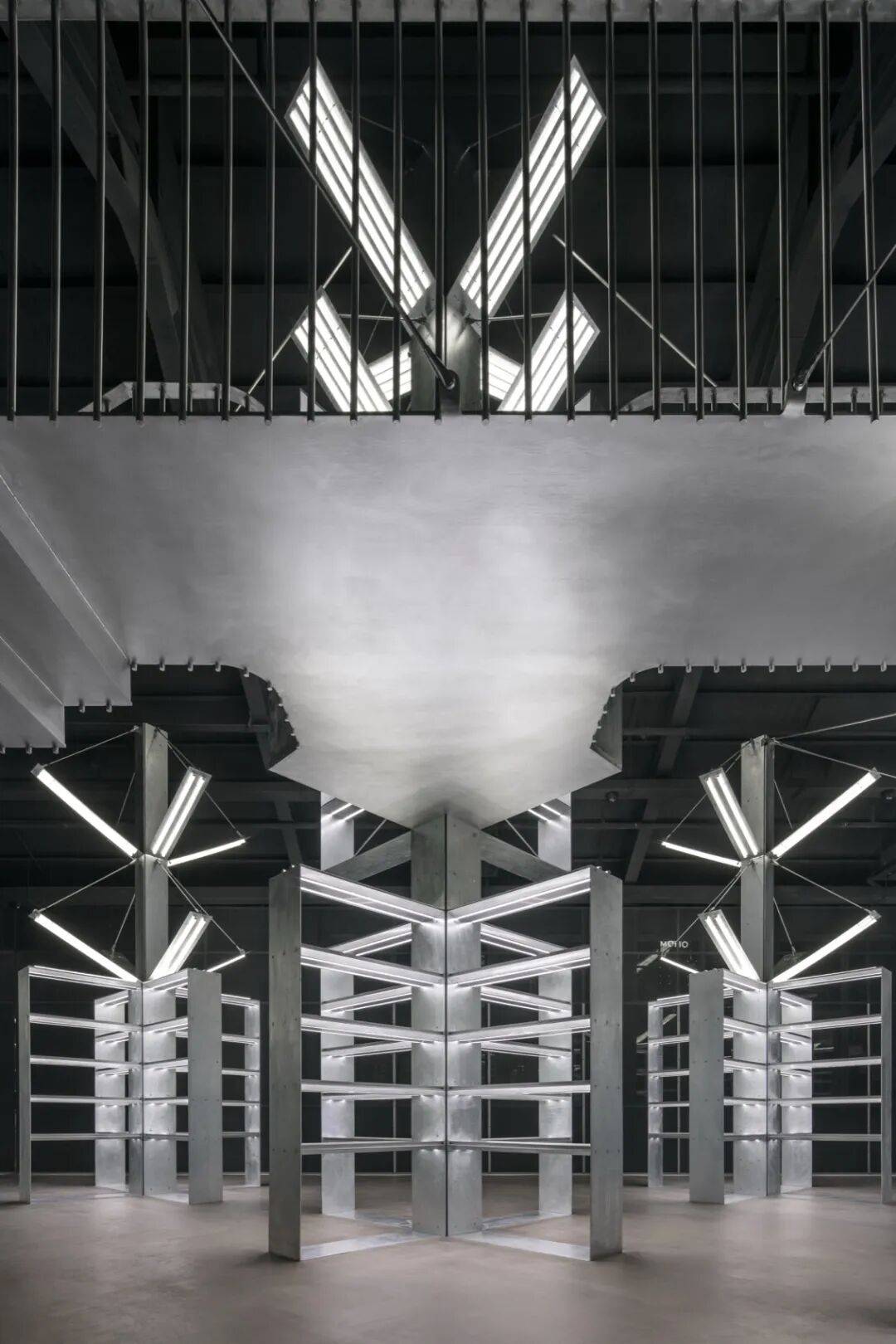 未来感营造:天桥俯瞰展架如“金属建筑群”,斜向灯管与固定背板模拟机械翼,强化科幻氛围。