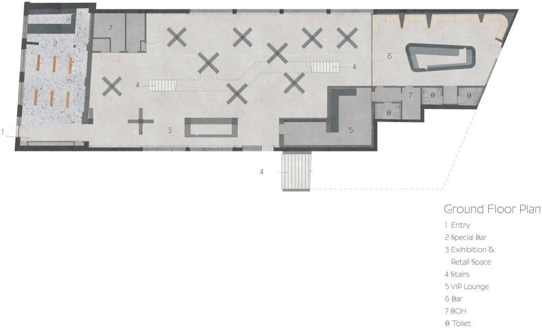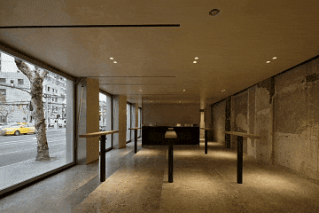 双层金属网分隔:展示区与酒吧区以深色金属网隔断,既保持视线穿透,又通过摩尔纹效应增强空间梦幻感。