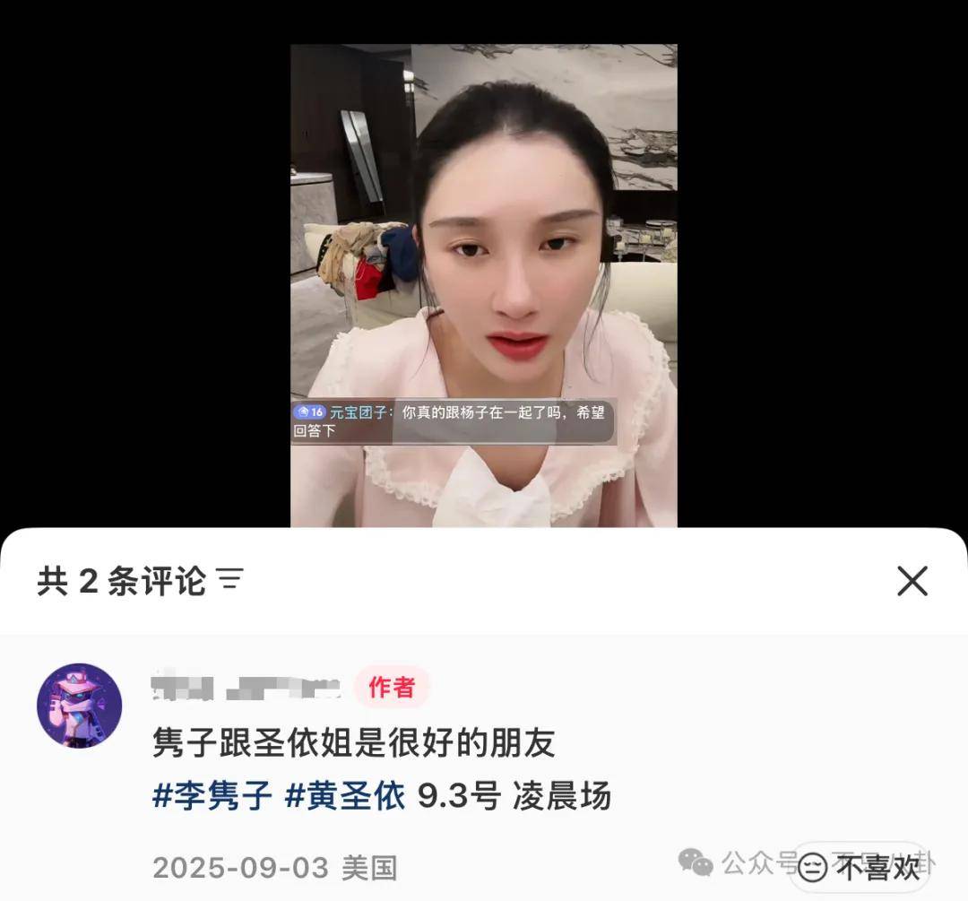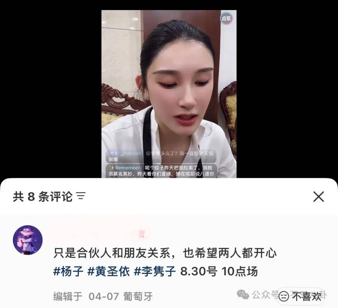 李隽子在直播中澄清自己和杨子的绯闻,声称和黄圣依是很好的朋友,自己有审美和择偶标准,不会看上好朋友的老公。然而,从事件的时间线来看,她已经和杨子有了孩子,这种澄清显得十分矛盾。有可能是她考虑到舆论压力,试图维护自己的形象,不想被贴上“第三者”的标签,但这种自相矛盾的说法反而让公众对她的信任度降低。