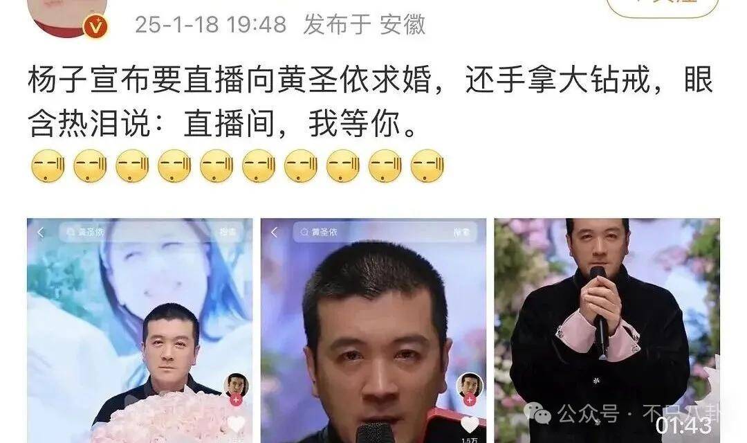 杨子在直播中向黄圣依求婚,声称自己净身出户,手头90%的现金都给了黄圣依,还买了戒指,但黄圣依根本不接电话。随后他又承认求婚是剧本,是独立策划没有和黄圣依商量。这一系列操作更像是为了炒作,利用和黄圣依的婚姻话题来吸引公众的关注,提升自己的热度。即使在李隽子已经怀孕即将生子的情况下,他依然不顾及李隽子的感受,继续消费和黄圣依的婚姻,这种行为实在是自私又可笑。