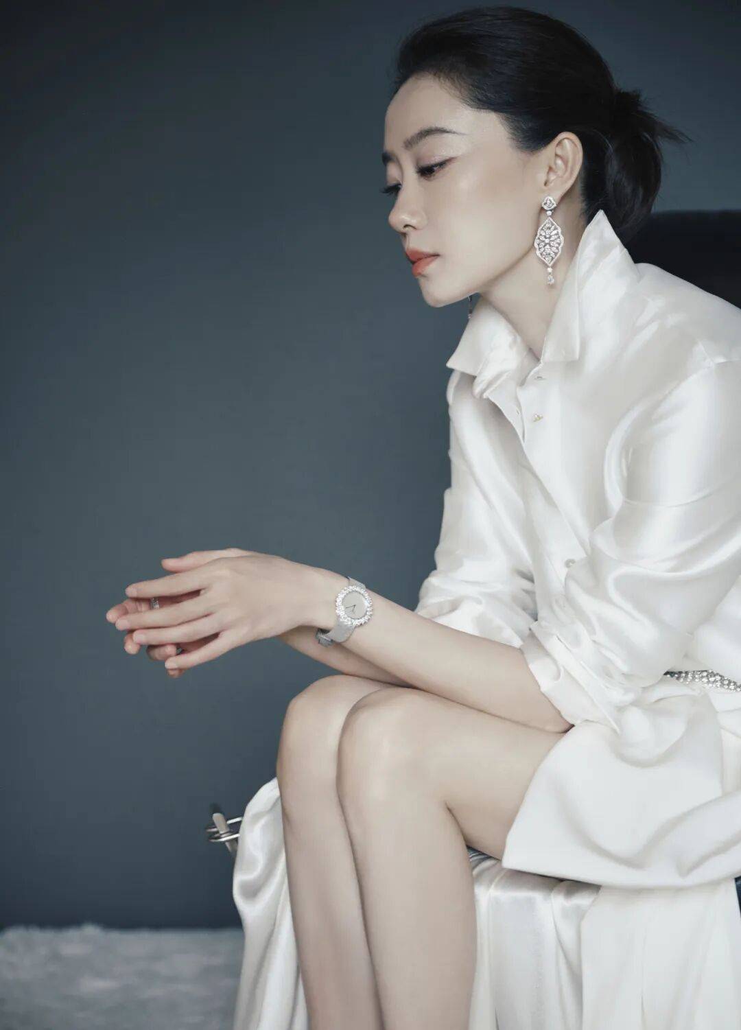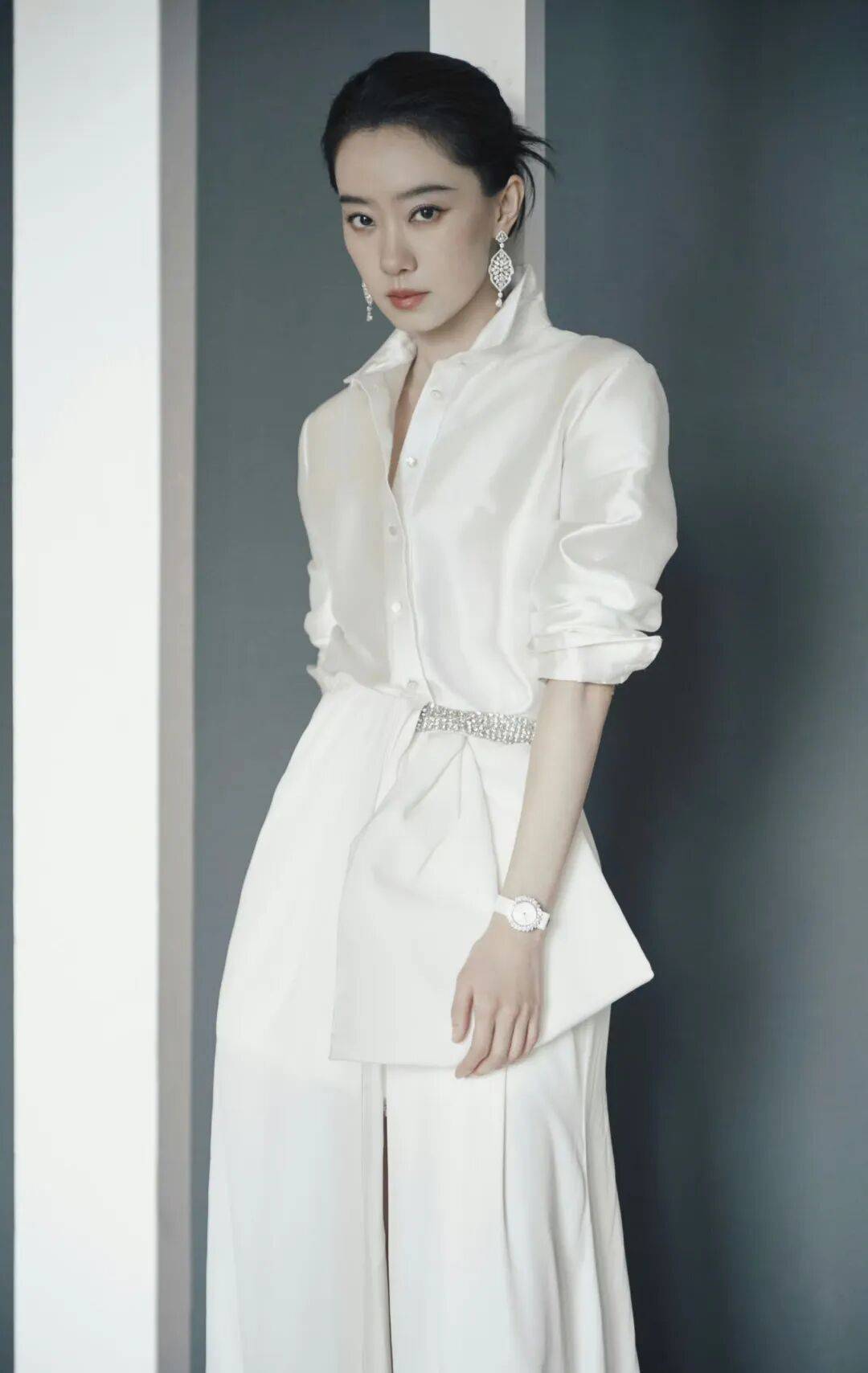 手腕上的白色手表,与白色礼服相得益彰,增添了几分精致感和时间感。发型还是标志性的低盘发,妆容清透淡雅,没有浓重的眼妆和口红,突出了她本身的好气质。