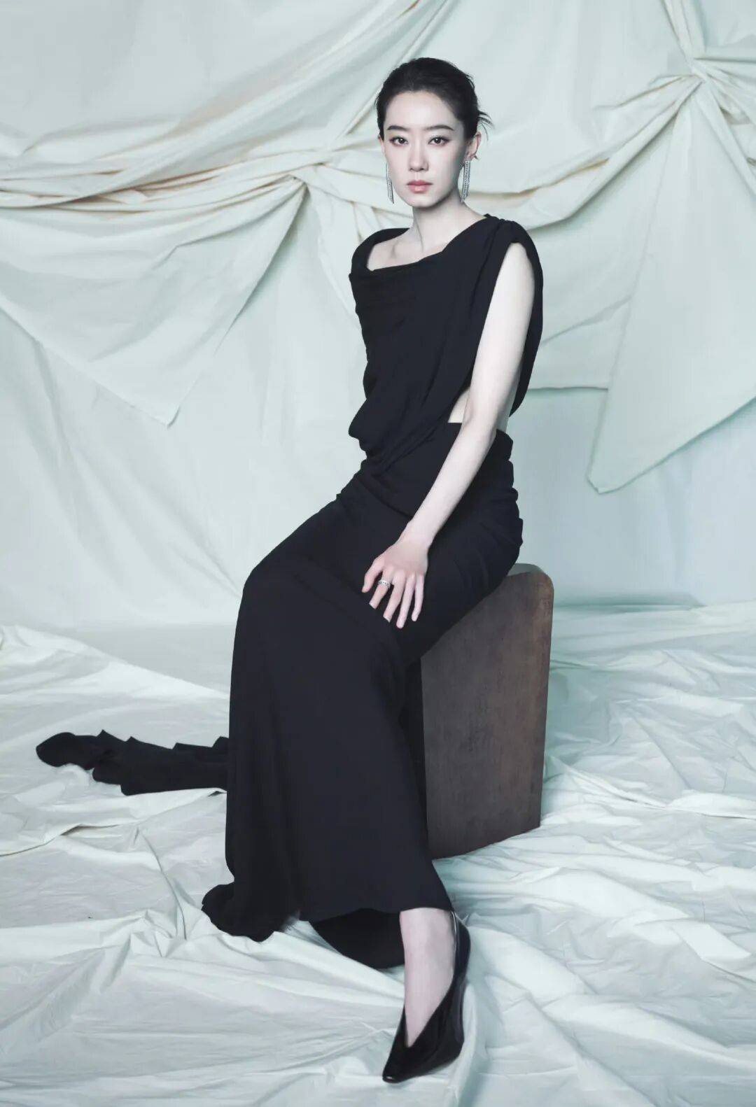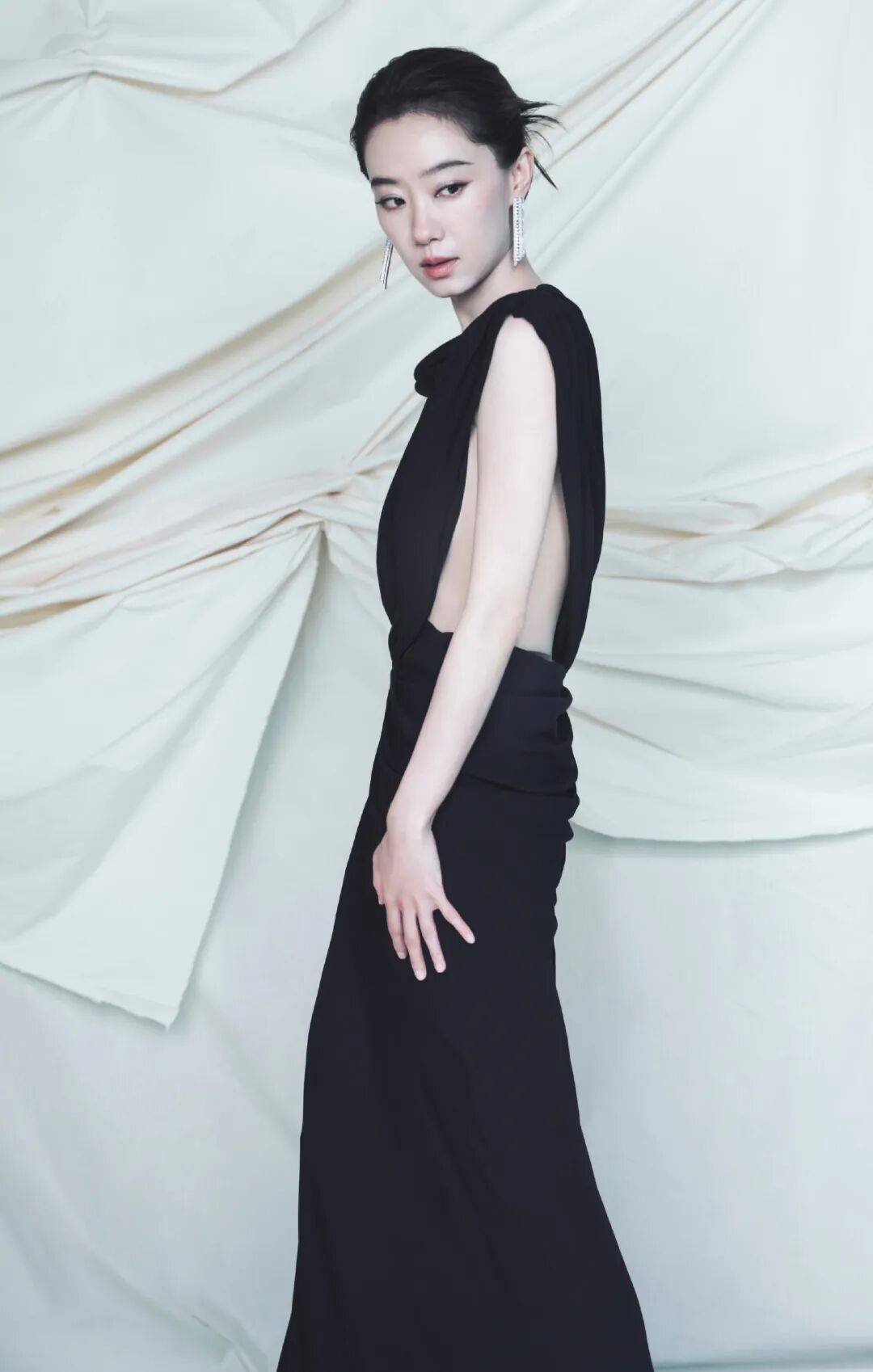 配饰上,她只戴了一对长款碎钻耳饰,在哑光黑的背景下微微闪烁,成为整个造型唯一的亮点。