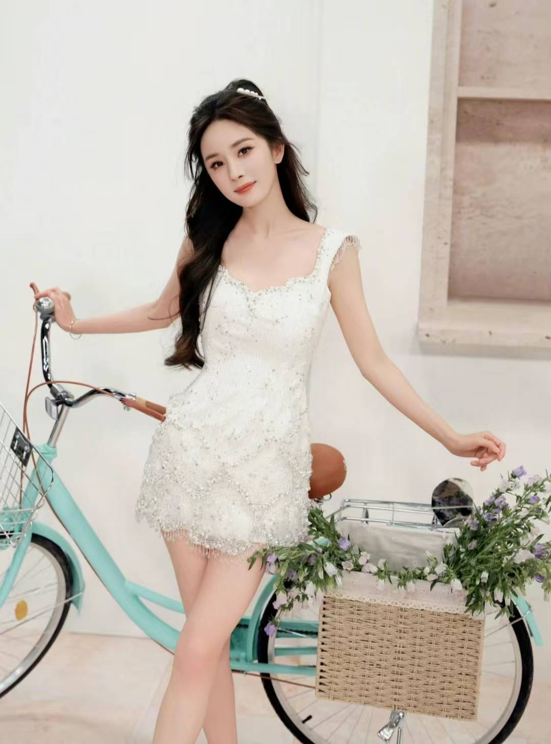 刷到杨幂这组图时,我直接对着屏幕“哇”出了声,这哪是出席活动,明明是把“甜酷少女”四个字焊在了身上!你看她身上这件白钻短裙,碎钻在灯光下闪得像把星星都缝在了上面,心形领口刚好露出精致的锁骨,裙摆处的流苏随着动作轻轻晃,既性感又不失俏皮。搭配的银色小皮鞋,鞋面上的蝴蝶结设计瞬间中和了裙子的成熟感,再加上她半扎的高马尾,发尾的大波浪卷随意垂在肩头,说她是刚毕业的大学生我都信!最绝的是她和单车同框的画面,一只手搭在车把上,身体微微前倾,眼神里全是灵动的光,好像下一秒就要骑着单车去兜风。