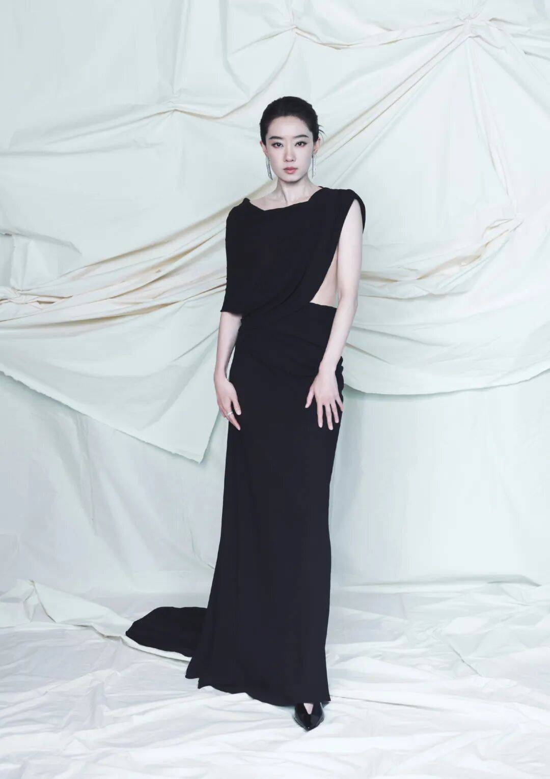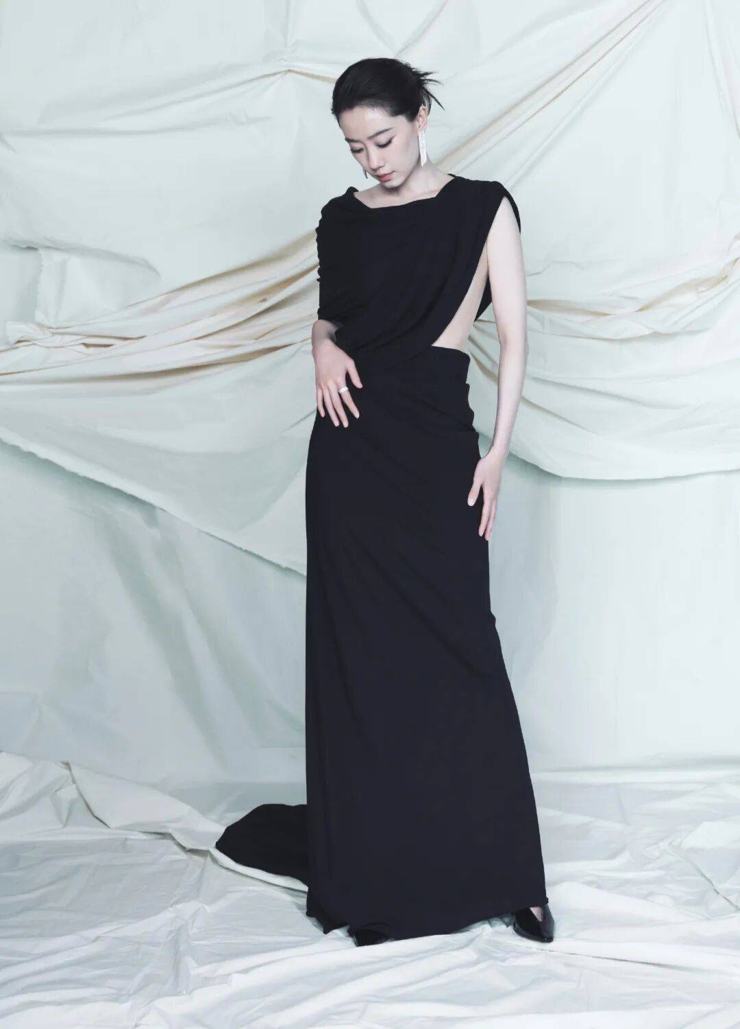 第一套黑色礼服,堪称“极简风教科书”。一袭哑光黑不对称长裙,将“少即是多”的设计理念演绎到了极致。