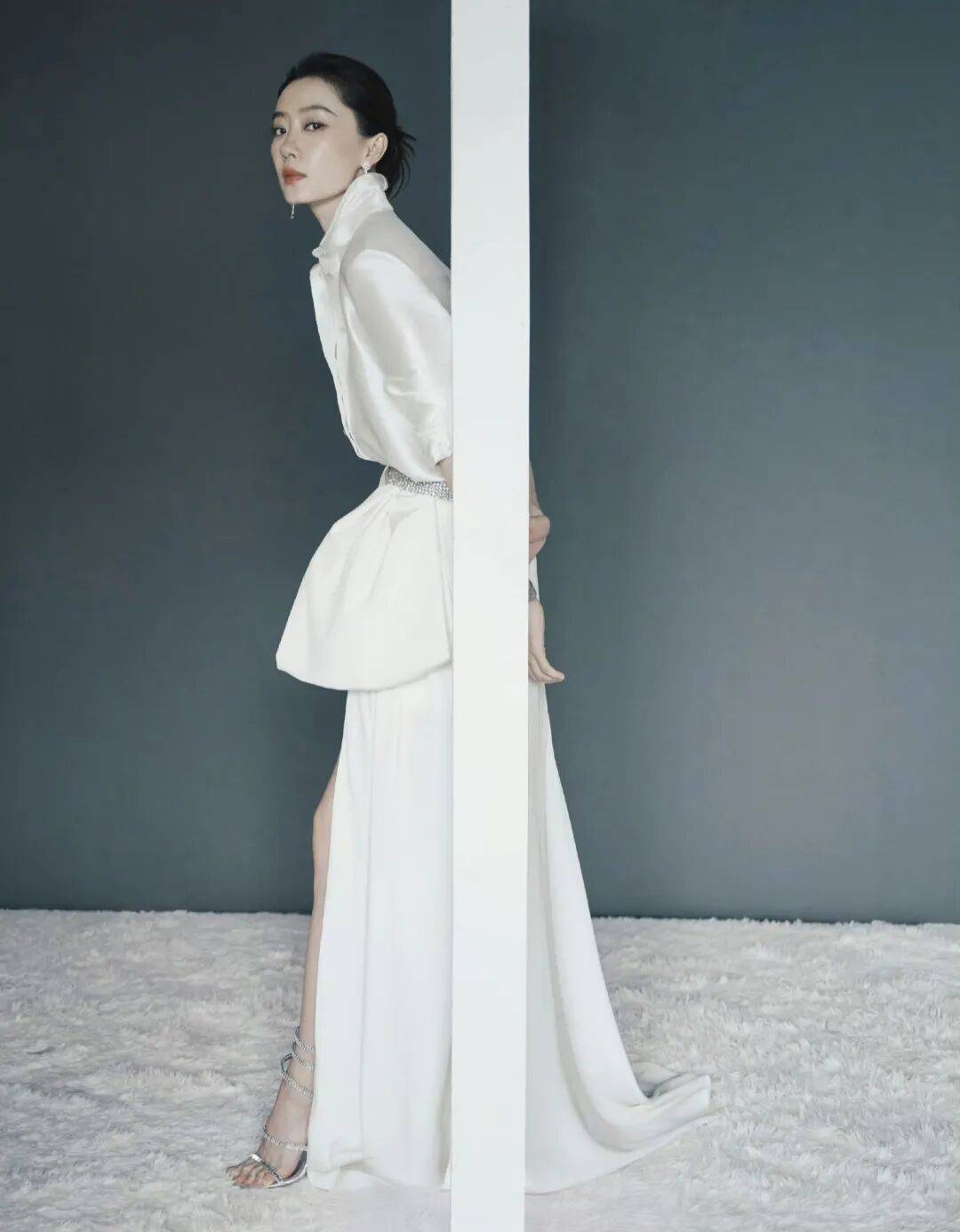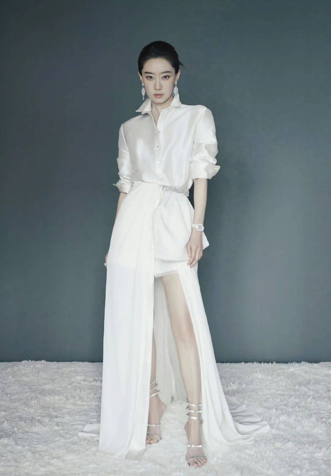 腰间的满钻腰带是整个造型的神来之笔,它不仅精准掐出了张小斐的蚂蚁腰,优化了头身比例,还为素雅的白色增添了一丝华丽感。