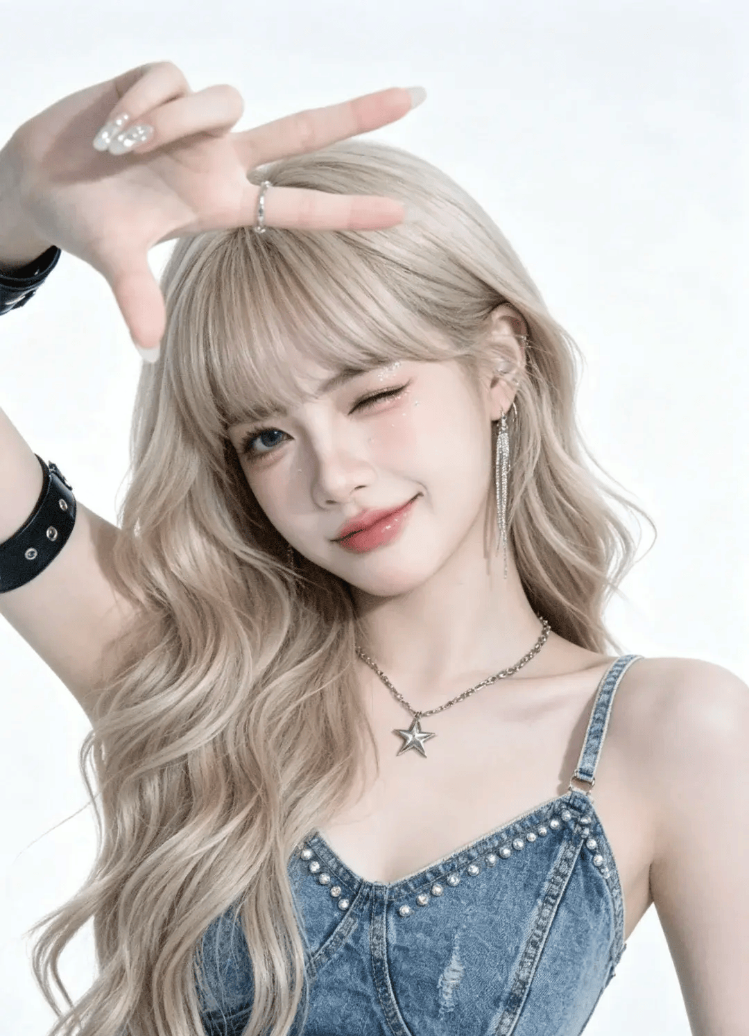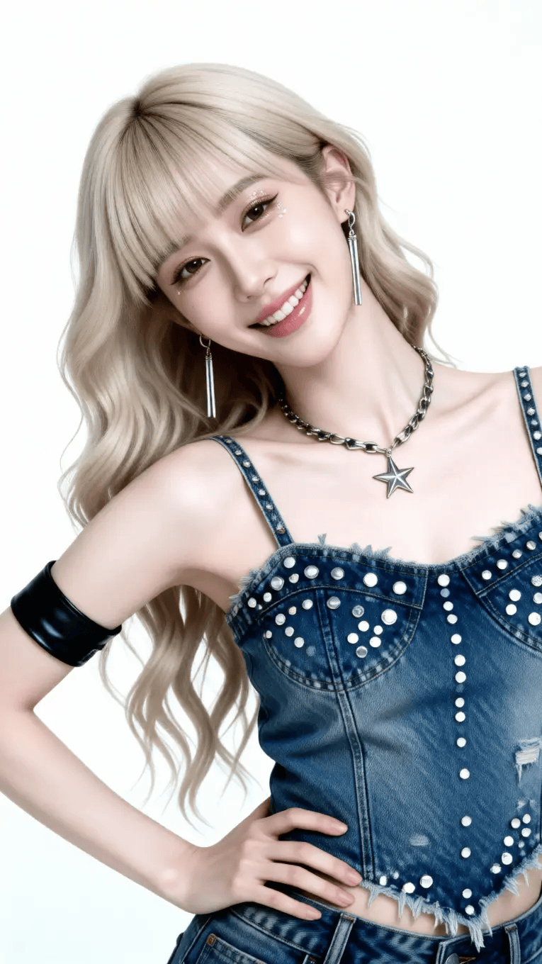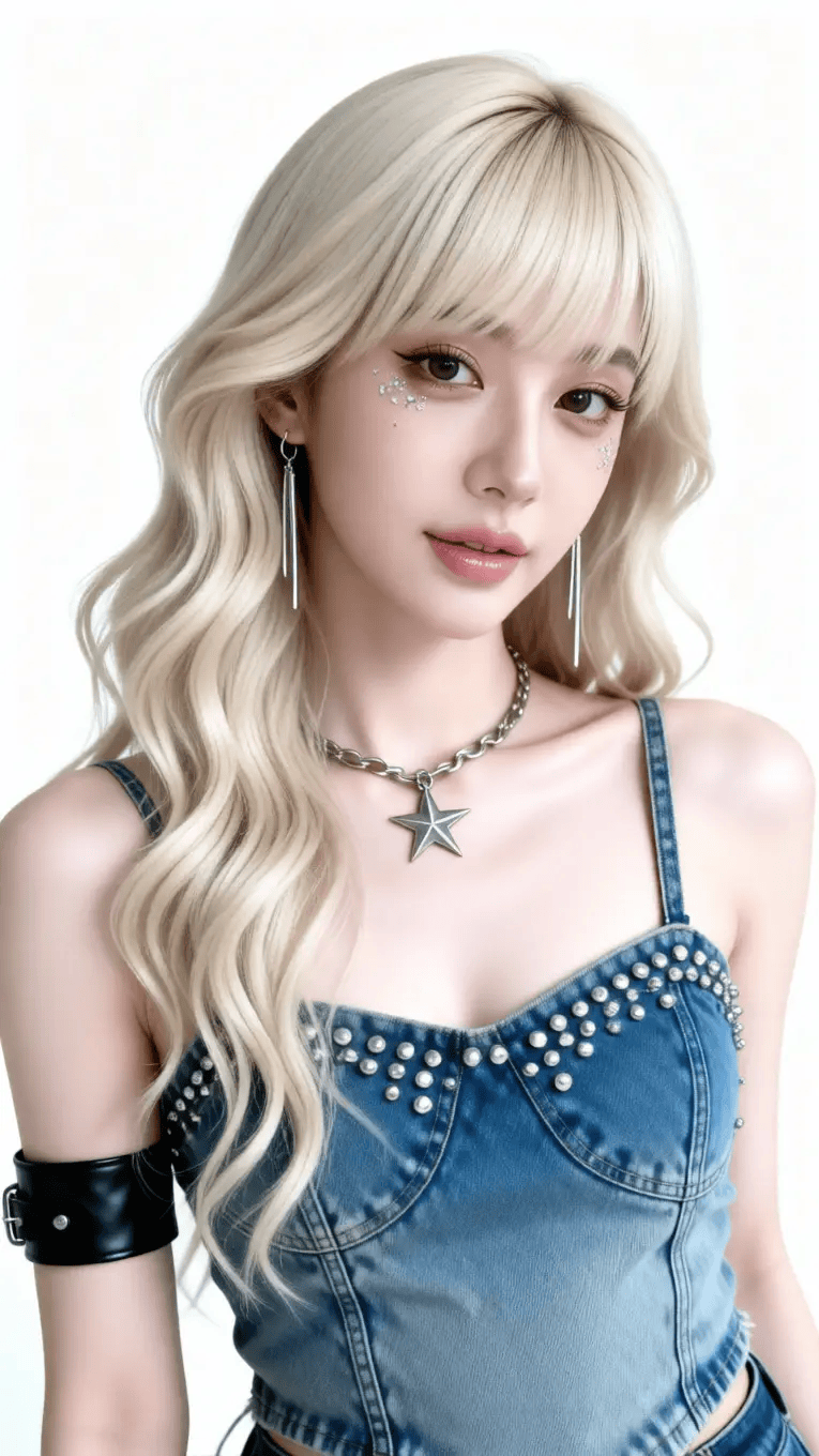 保持人物五官脸型不变;浅金大波浪卷发+韩系斜刘海,甜酷辣妹妆(截断式眼妆+亮片点缀+水光唇),穿做旧牛仔蓝钉钻吊带辣妹上衣,搭配黑色皮质臂环、金属星星项链、银色长款耳饰;背景是纯白简约影棚,韩系女团风写真,冷白皮质感,柔和影棚补光,低饱和冷调,胶片颗粒感,高清8K,细节拉满