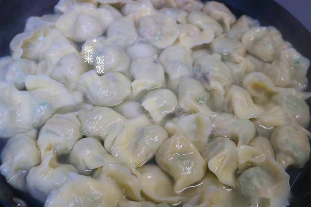 6,水开下入饺子,用铲子沿着锅底推动两圈防止粘锅。盖上盖子,中小火煮到饺子漂浮,饺子皮变得透明,饺子就熟了。