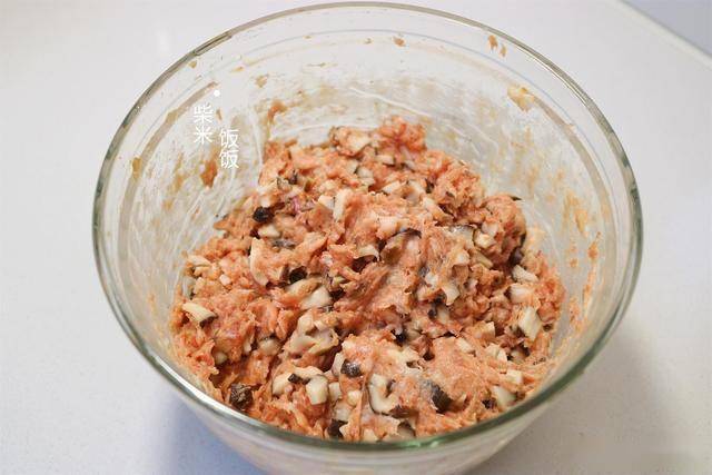 3,焯过水的香菇切丁,加到肉馅里,再少加点盐,搅拌均匀。
