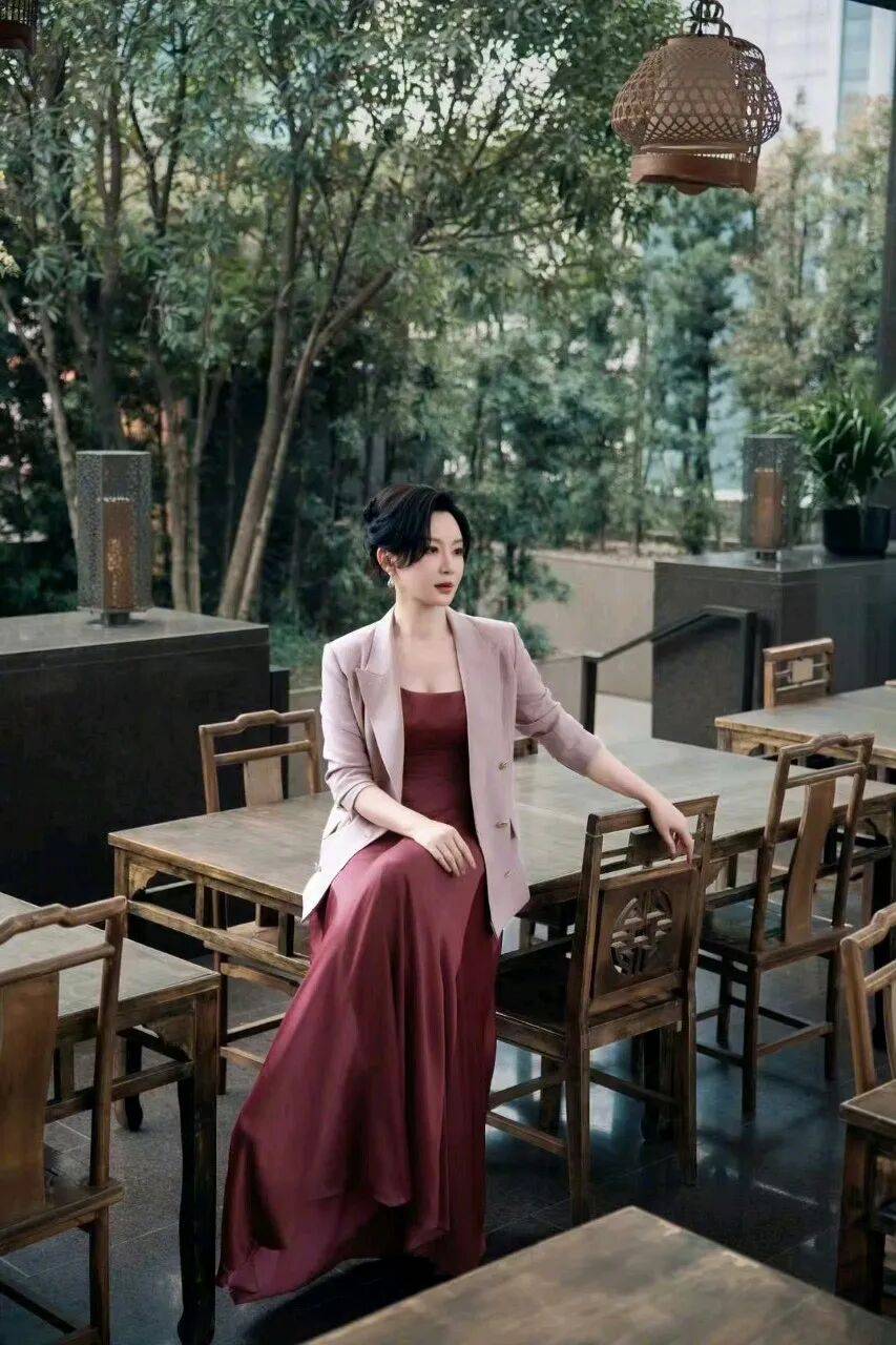 2. 豆沙粉西装 + 酒红缎面长裙:配色绝妙,低饱和豆沙粉西装自带温柔灰调,显白又无俗气感;酒红色缎面吊带长裙与西装质感碰撞,提升贵气感。同属暖调的撞色温柔不突兀,比同色系搭配更有层次。收腰西装敞开穿,露出缎面裙高腰线,优化身材比例,小个子也能穿出三七分效果。搭配盘发和珍珠耳钉,优雅贵气,可穿去晚宴、约会等活动,把西装穿出礼服质感。