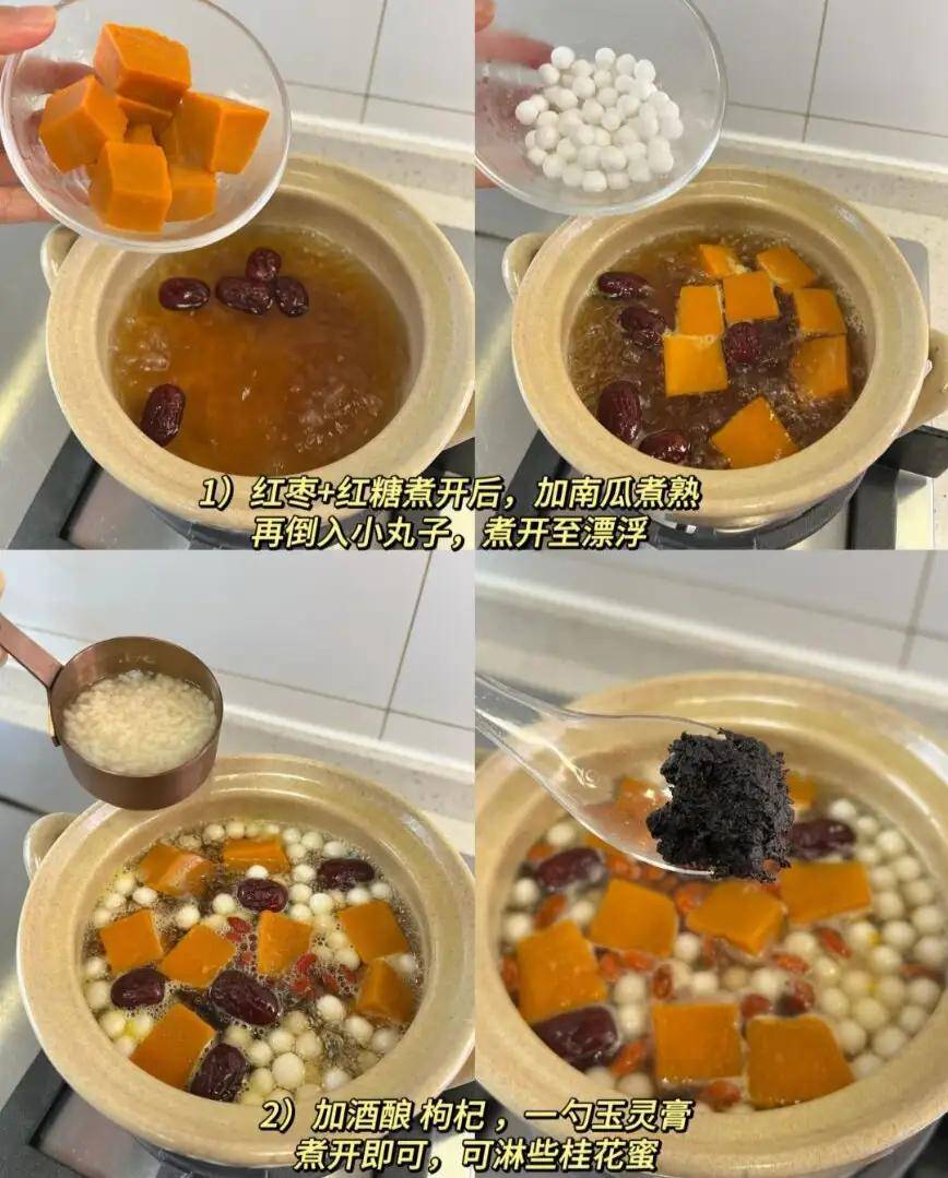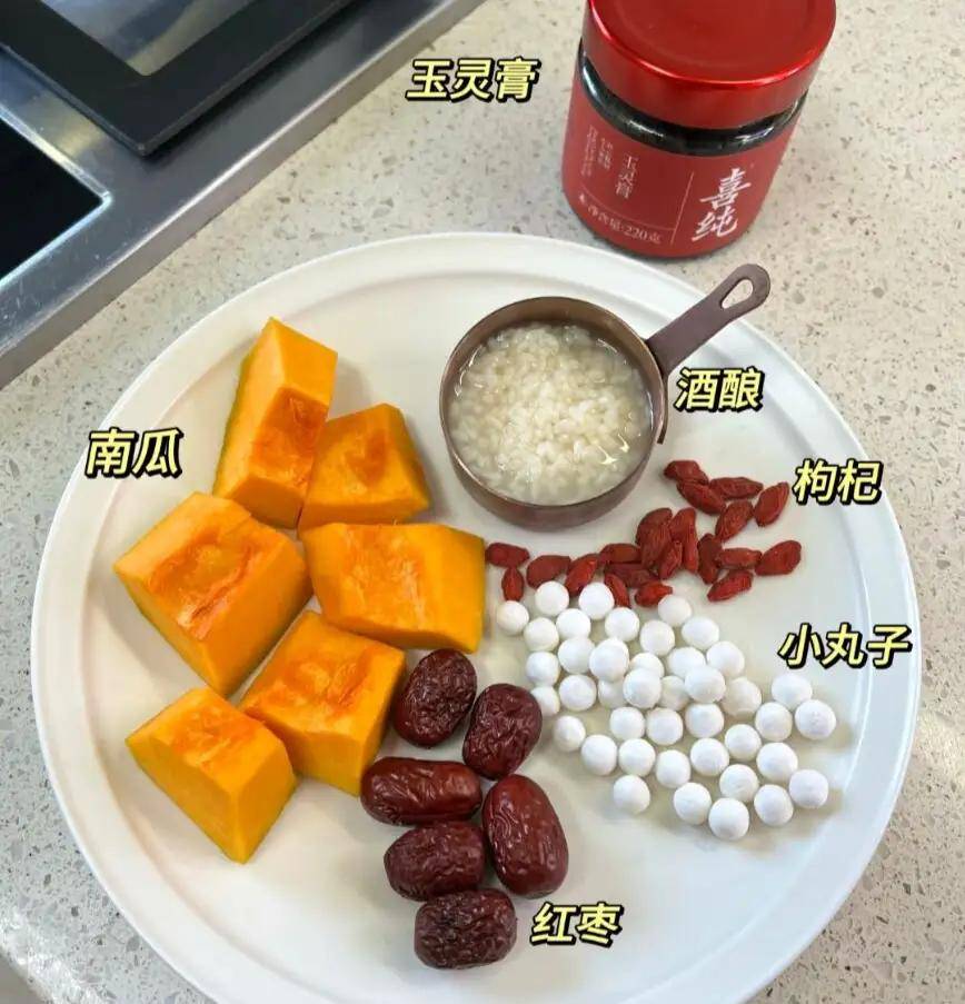 这款最惊喜。南瓜富含维E和锌,酒酿是发酵过的糯米,活血暖宫,加上玉灵膏(桂圆+西洋参熬制的补血膏方)或者简易做法,做成甜品,女人没有不爱的。