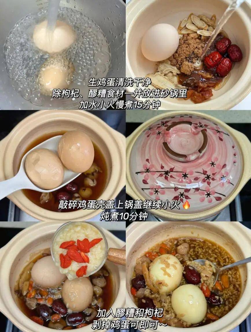 锅里加两碗水,放当归、黄芪、红枣,大火烧开转小火煮15分钟,把药味煮出来。然后放入剥好的鸡蛋和红糖,继续煮10分钟。关火前撒枸杞。