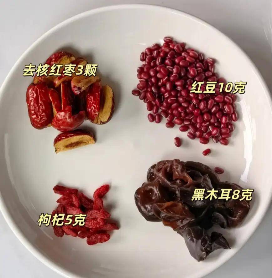 黑木耳是血管的清道夫,红豆补心血,红枣补气,黄豆提供植物雌激素。四样打在一起,从里往外养,脸色自然红润。