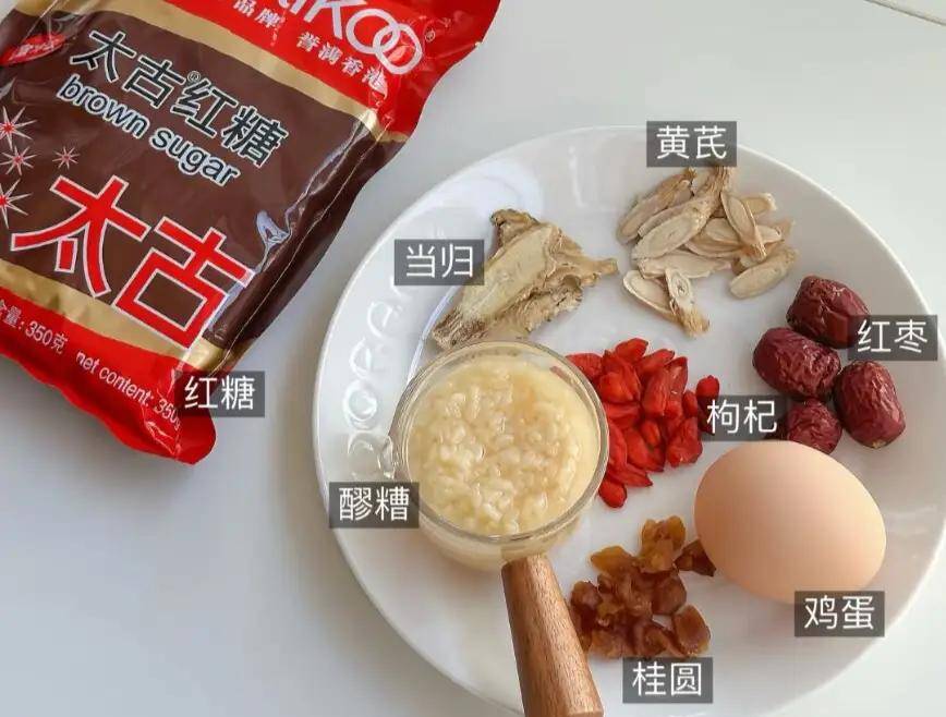 食材:当归3克、黄芪5克、红糖一块、鸡蛋2个、红枣3颗、枸杞少许。